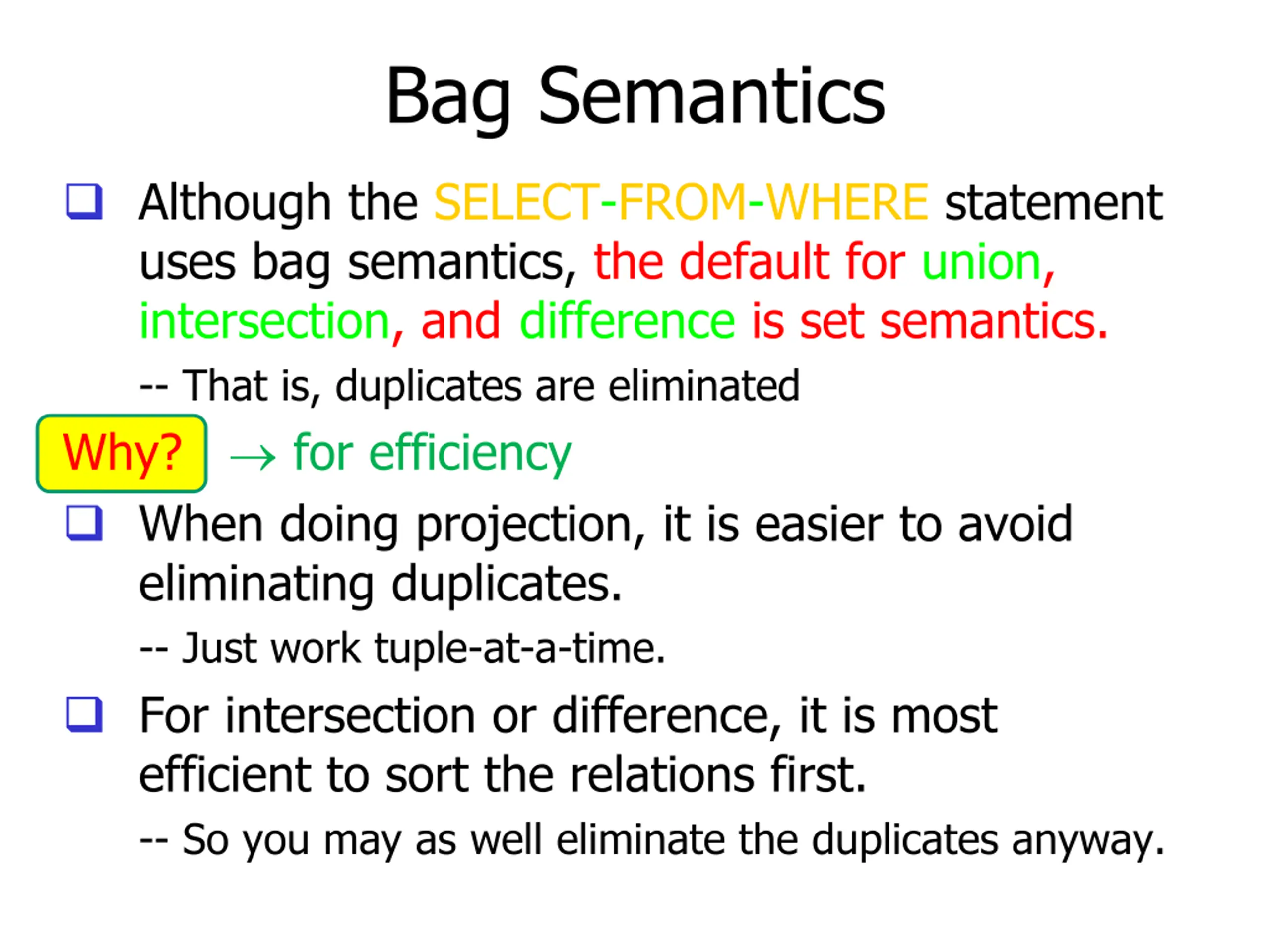 Bag Semantics Although the SELECT-FROM-WHERE statement uses bag semantics, the default for union, intersection, and difference is set semantics. -- That is, duplicates are eliminated Why? for efficiency When doing projection, it is easier to avoid eliminating duplicates. -- Just work tuple-at-a-time. For intersection or difference, it is most efficient to sort the relations first. -- So you may as well eliminate the duplicates anyway.