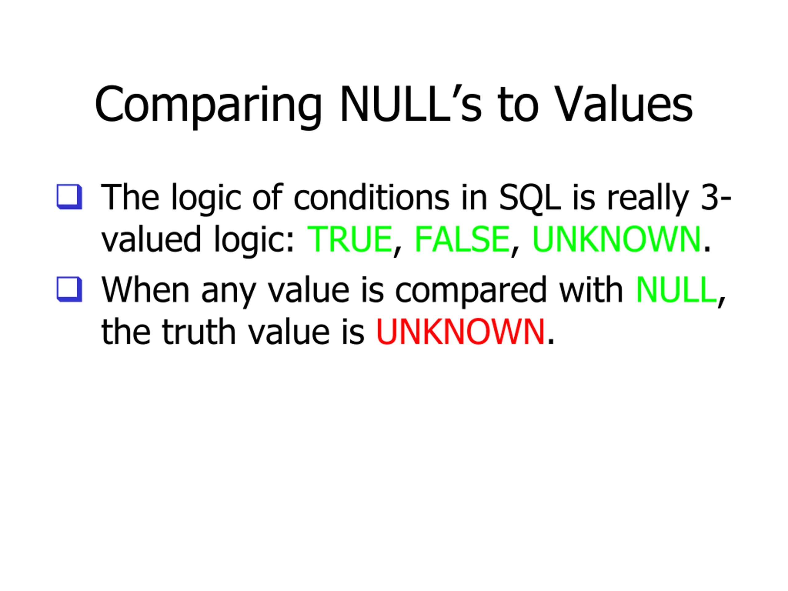 Comparing NULLs to Values The logic of conditions in SQL is really 3- valued logic: TRUE, FALSE, UNKNOWN. When any value is compared with NULL, the truth value is UNKNOWN.