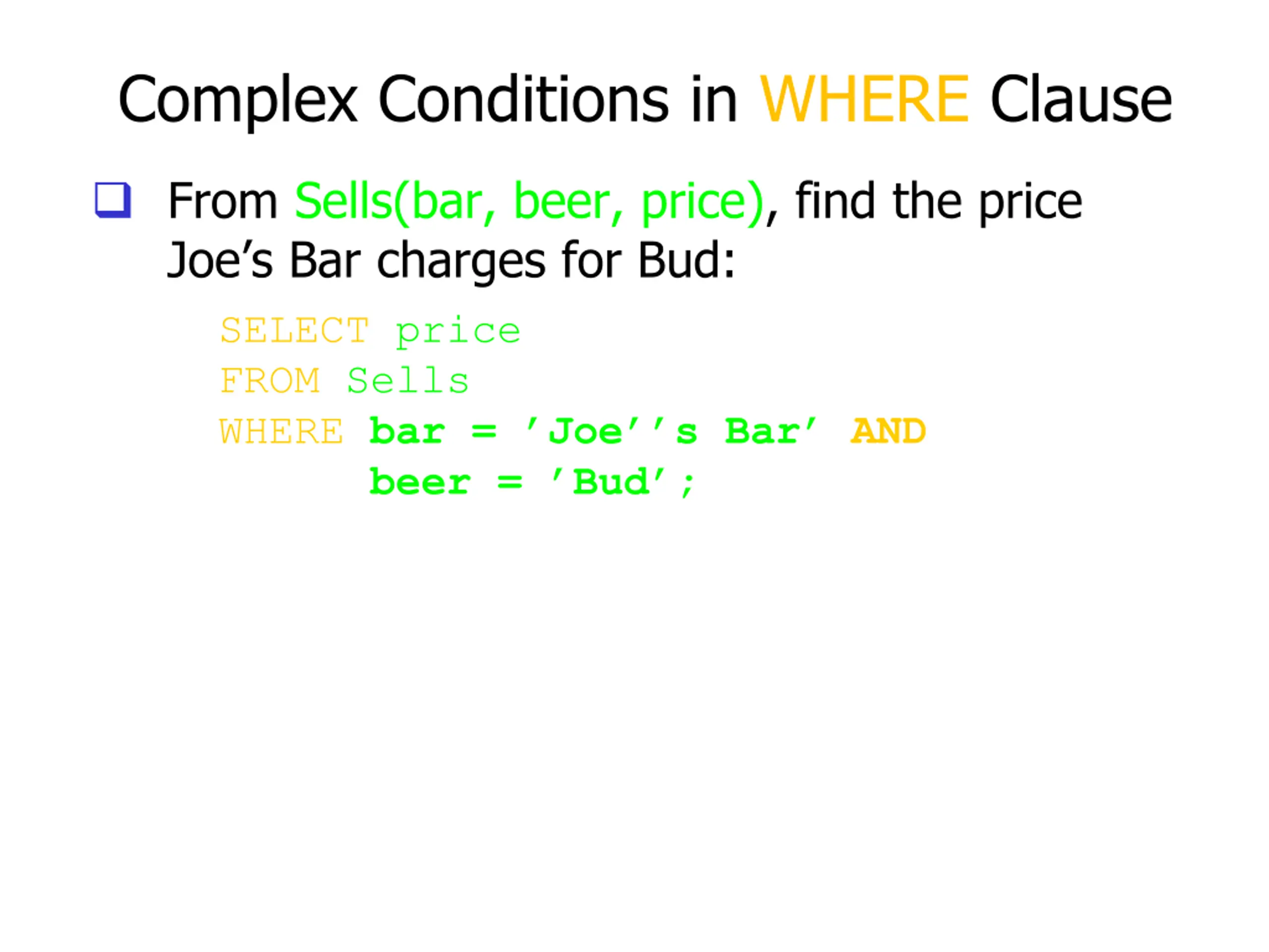 Complex Conditions in WHERE Clause From Sells(bar, beer, price), find the price Joe s Bar charges for Bud: SELECT price FROM Sells WHERE bar = Joe sBar AND beer = Bud ;