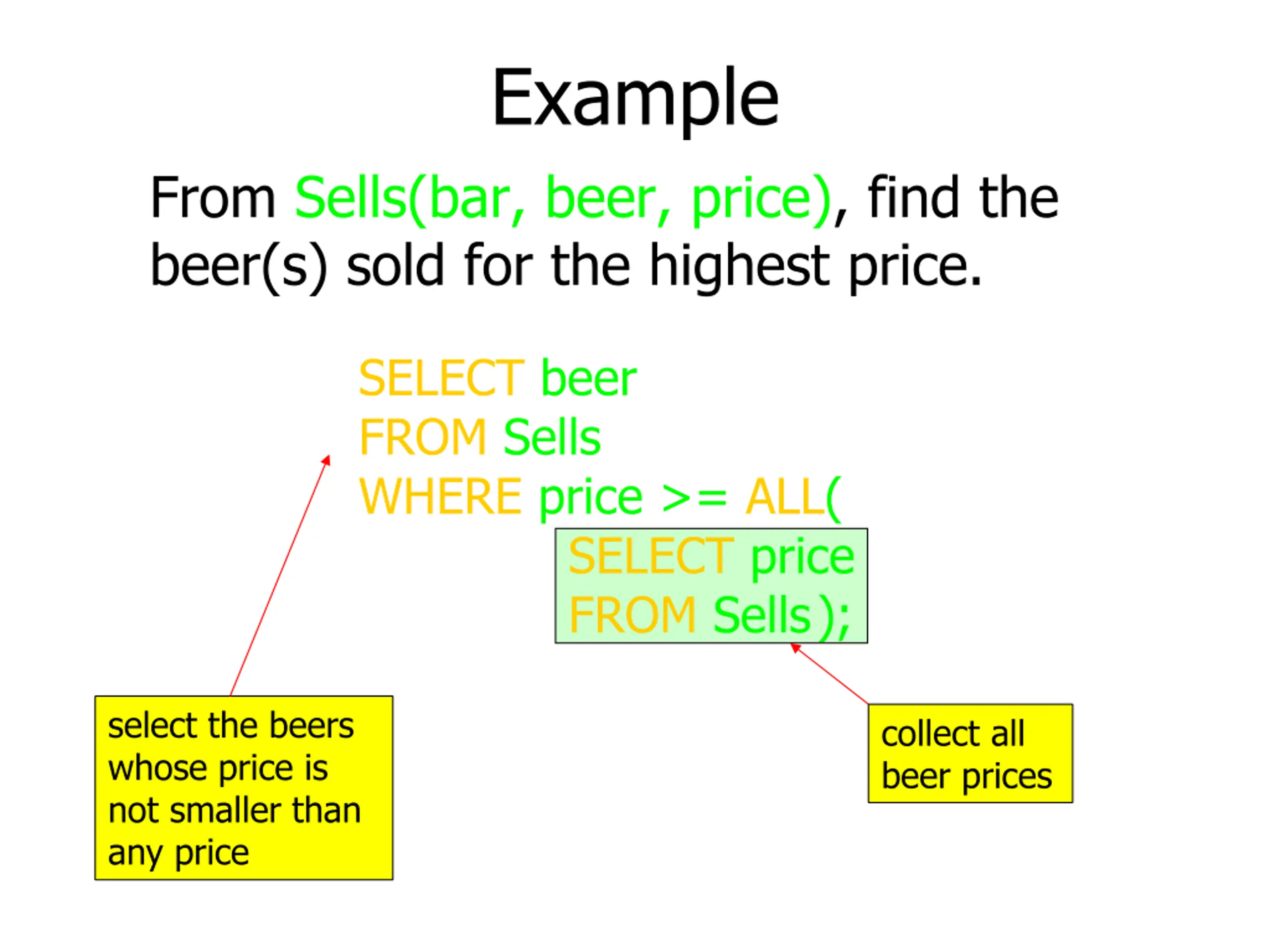 Example From Sells(bar, beer, price), find the beer(s) sold for the highest price. SELECT beer FROM Sells WHERE price >= ALL( FROM Sells SELECT price ); select the beers whose price is not smaller than any price collect all beer prices