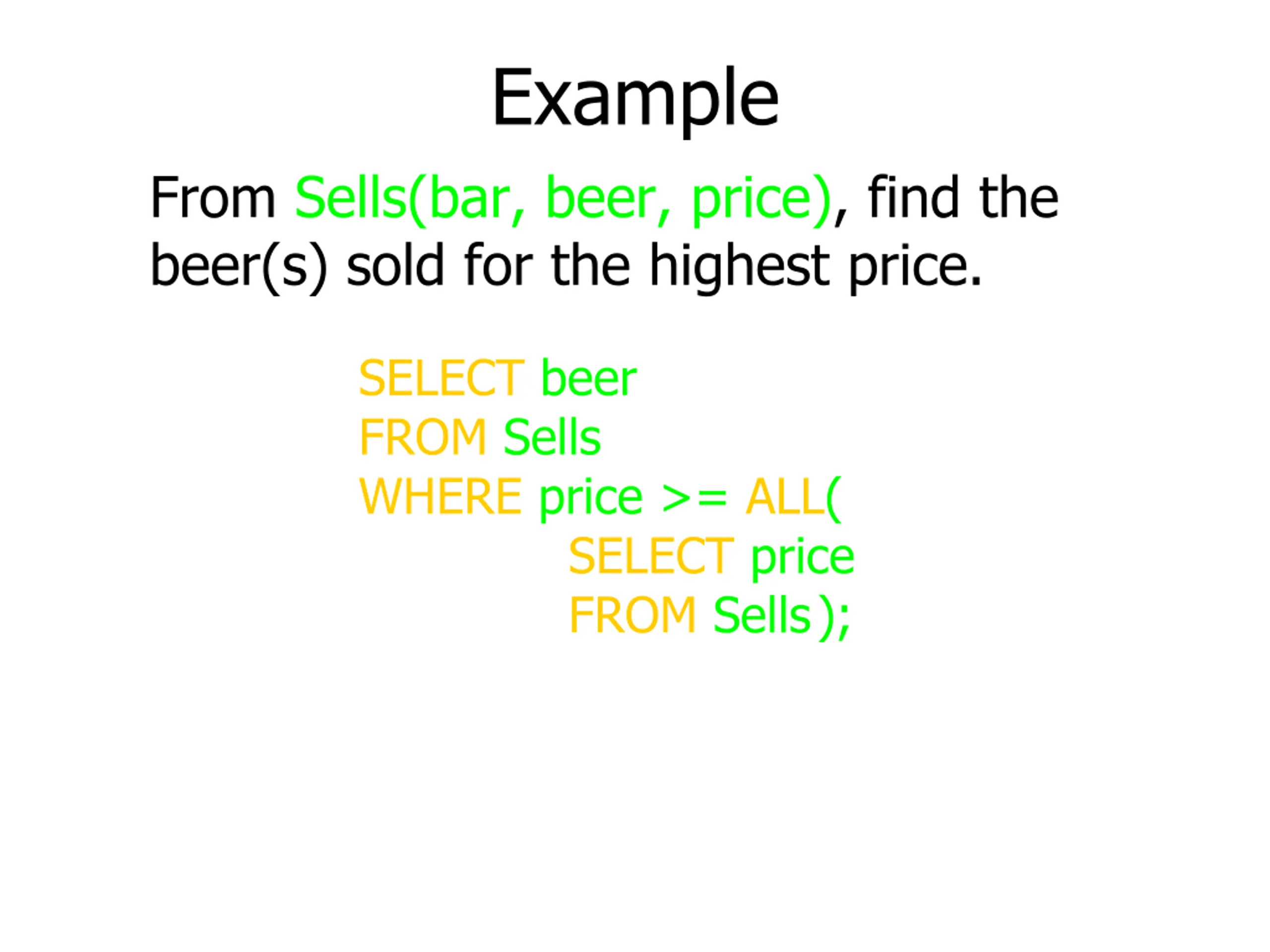 Example From Sells(bar, beer, price), find the beer(s) sold for the highest price. SELECT beer FROM Sells WHERE price >= ALL( FROM Sells SELECT price );