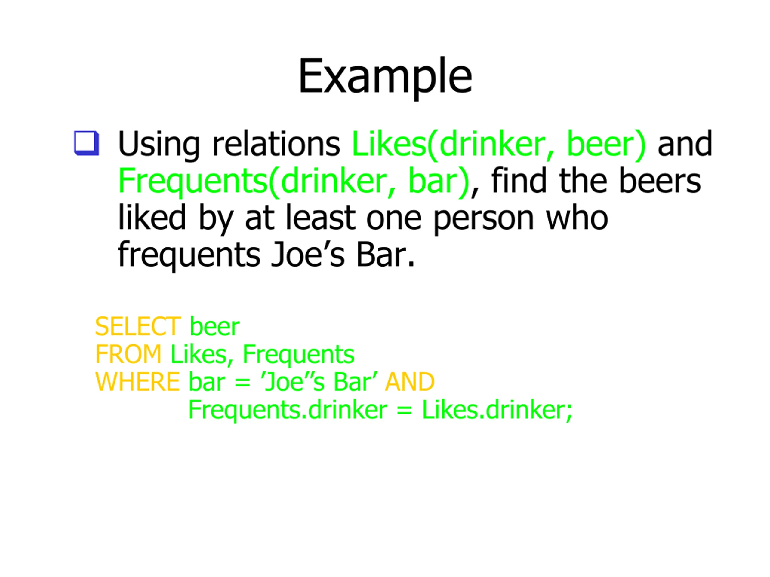 Example Using relations Likes(drinker, beer) and Frequents(drinker, bar), find the beers liked by at least one person who frequents Joe s Bar. SELECT beer FROM Likes, Frequents WHERE bar = Joe sBar AND Frequents.drinker = Likes.drinker;