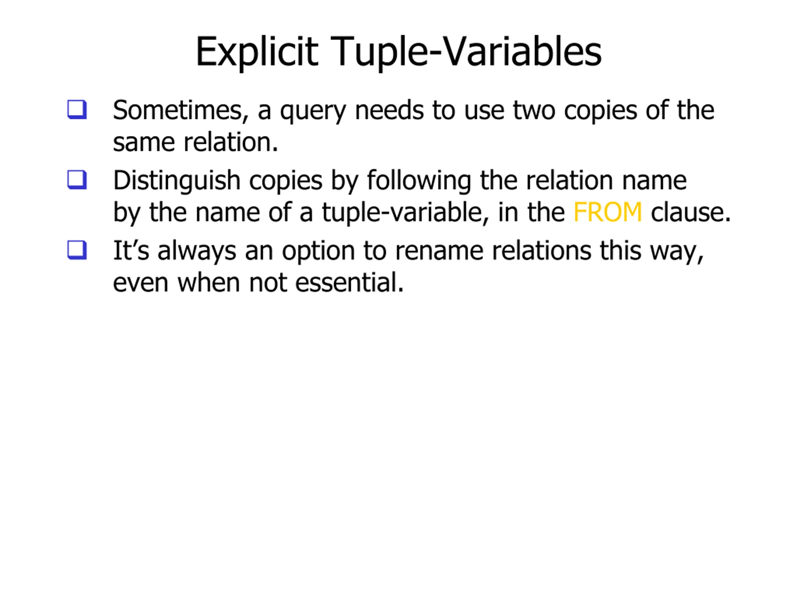 Explicit Tuple-Variables Sometimes, a query needs to use two copies of the same relation. Distinguish copies by following the relation name by the name of a tuple-variable, in the FROM clause. It s always an option to rename relations this way, even when not essential.
