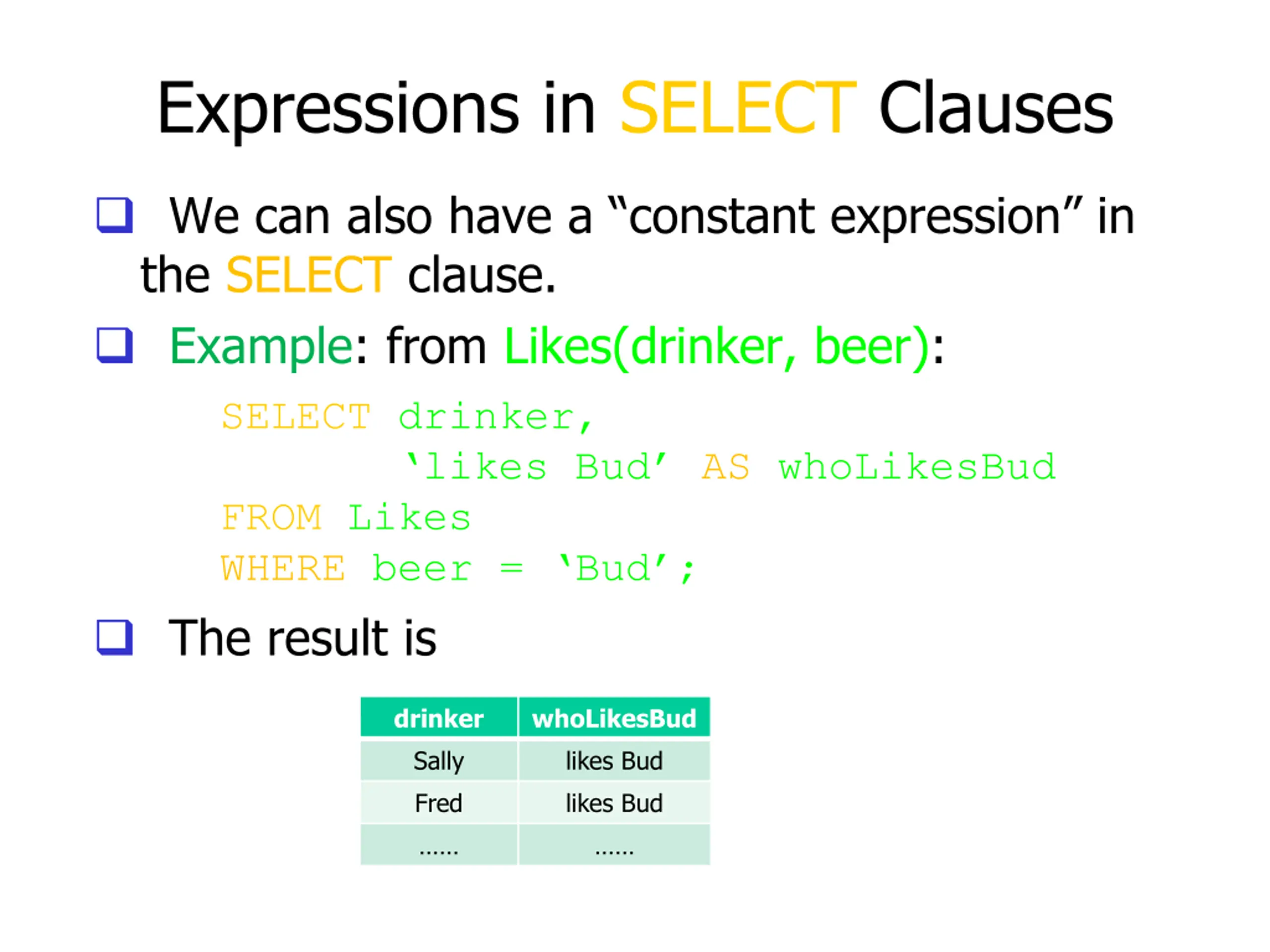 Expressions in SELECT Clauses We can also have a constant expression in the SELECT clause. Example: from Likes(drinker, beer): SELECT drinker, likes Bud AS whoLikesBud FROM Likes WHERE beer = Bud ; The result is drinker whoLikesBud Sally likes Bud Fred likes Bud