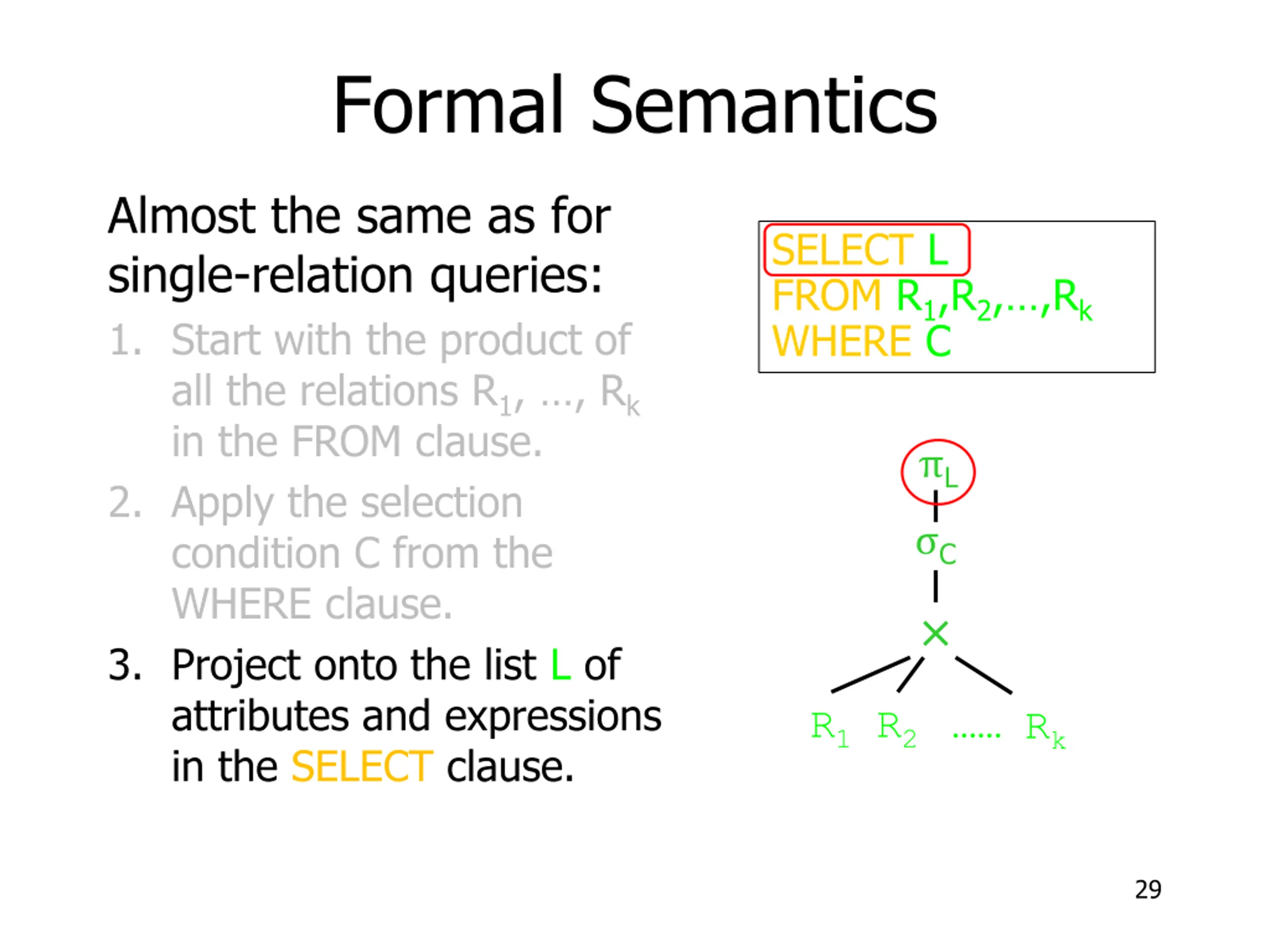 Formal Semantics Almost the same as for single-relation queries: 1. Start with the product of all the relations R1, , Rk in the FROM clause. 2. Apply the selection condition C from the WHERE clause. SELECT L FROM R1,R2, ,Rk WHERE C C R1 R2 Rk 28