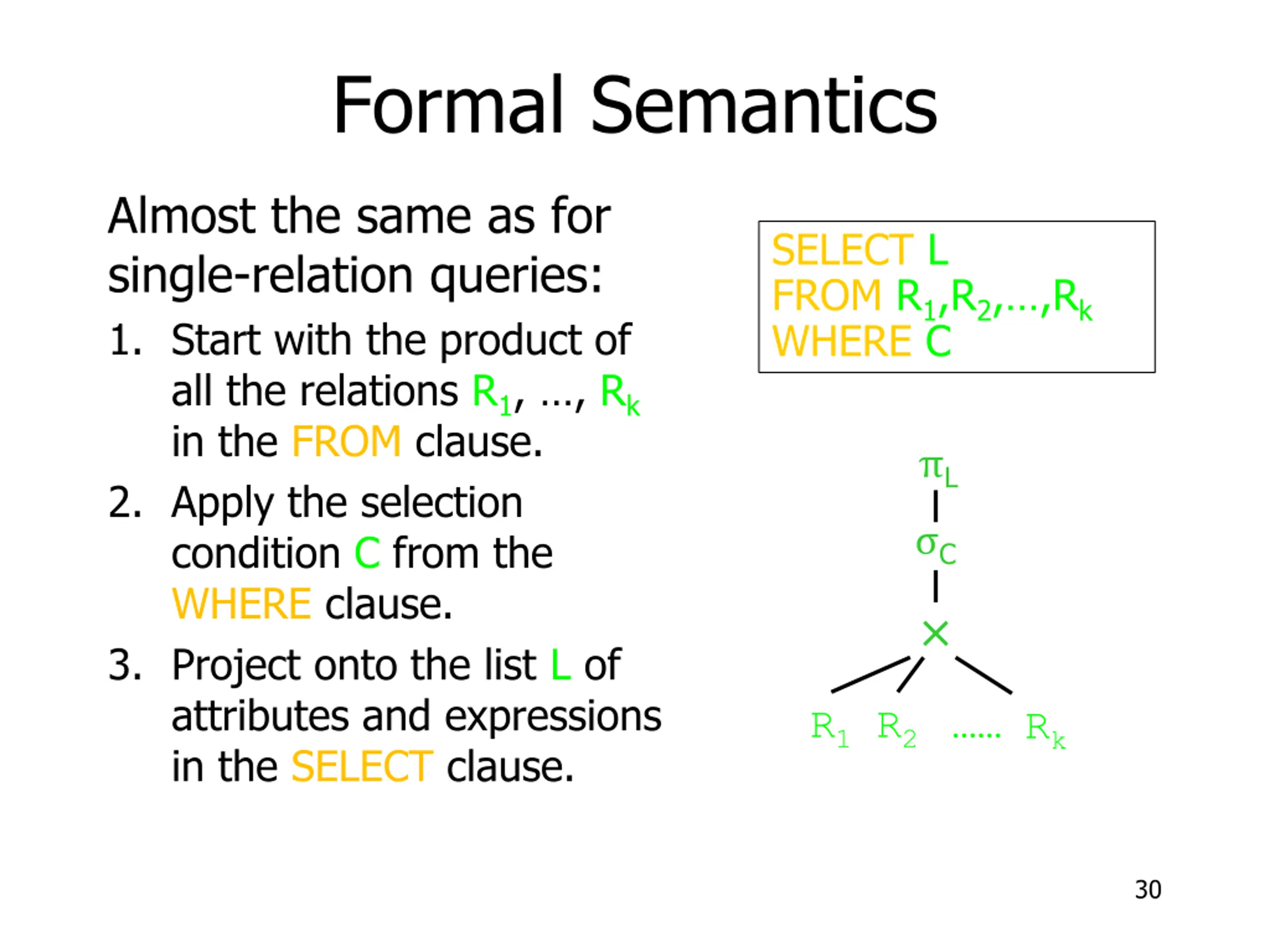 Formal Semantics Almost the same as for single-relation queries: 1. Start with the product of all the relations R1, , Rk in the FROM clause. 2. Apply the selection condition C from the WHERE clause. 3. Project onto the list L of attributes and expressions in the SELECT clause. SELECT L FROM R1,R2, ,Rk WHERE C L C R1 R2 Rk 29
