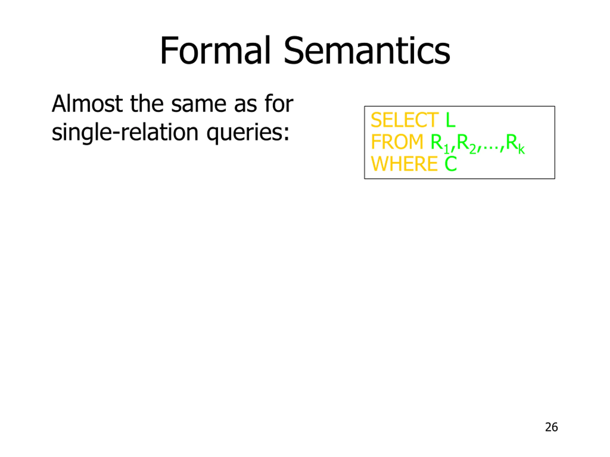Formal Semantics Almost the same as for single-relation queries: 1. Start with the product of all the relations R1, , Rk in the FROM clause. SELECT L FROM R1,R2, ,Rk WHERE C R1 R2 Rk 27