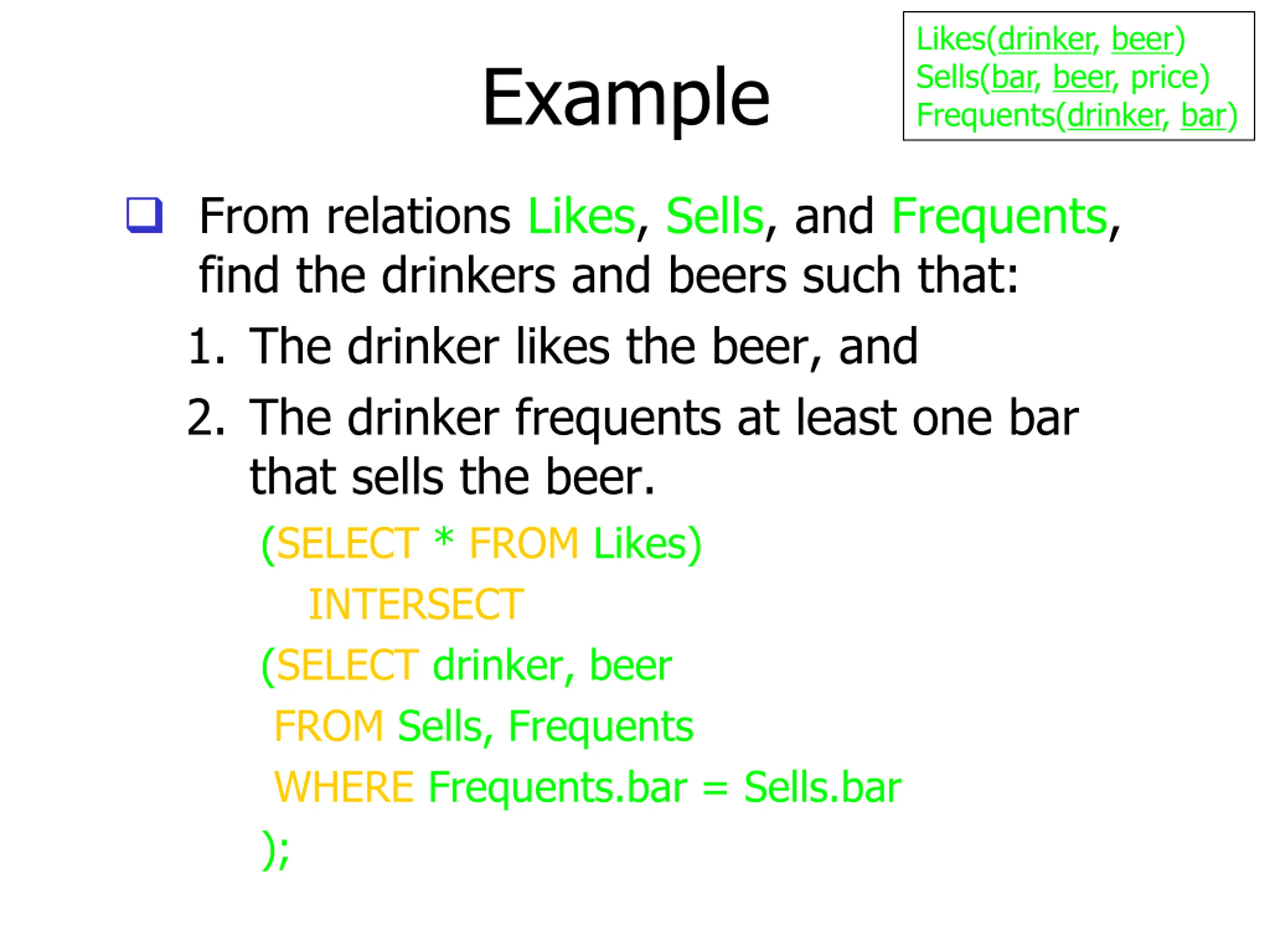 Likes(drinker, beer) Sells(bar, beer, price) Frequents(drinker, bar) Example From relations Likes, Sells, and Frequents, find the drinkers and beers such that: 1. The drinker likes the beer, and 2. The drinker frequents at least one bar that sells the beer. (SELECT * FROM Likes) INTERSECT (SELECT drinker, beer FROM Sells, Frequents WHERE Frequents.bar = Sells.bar );