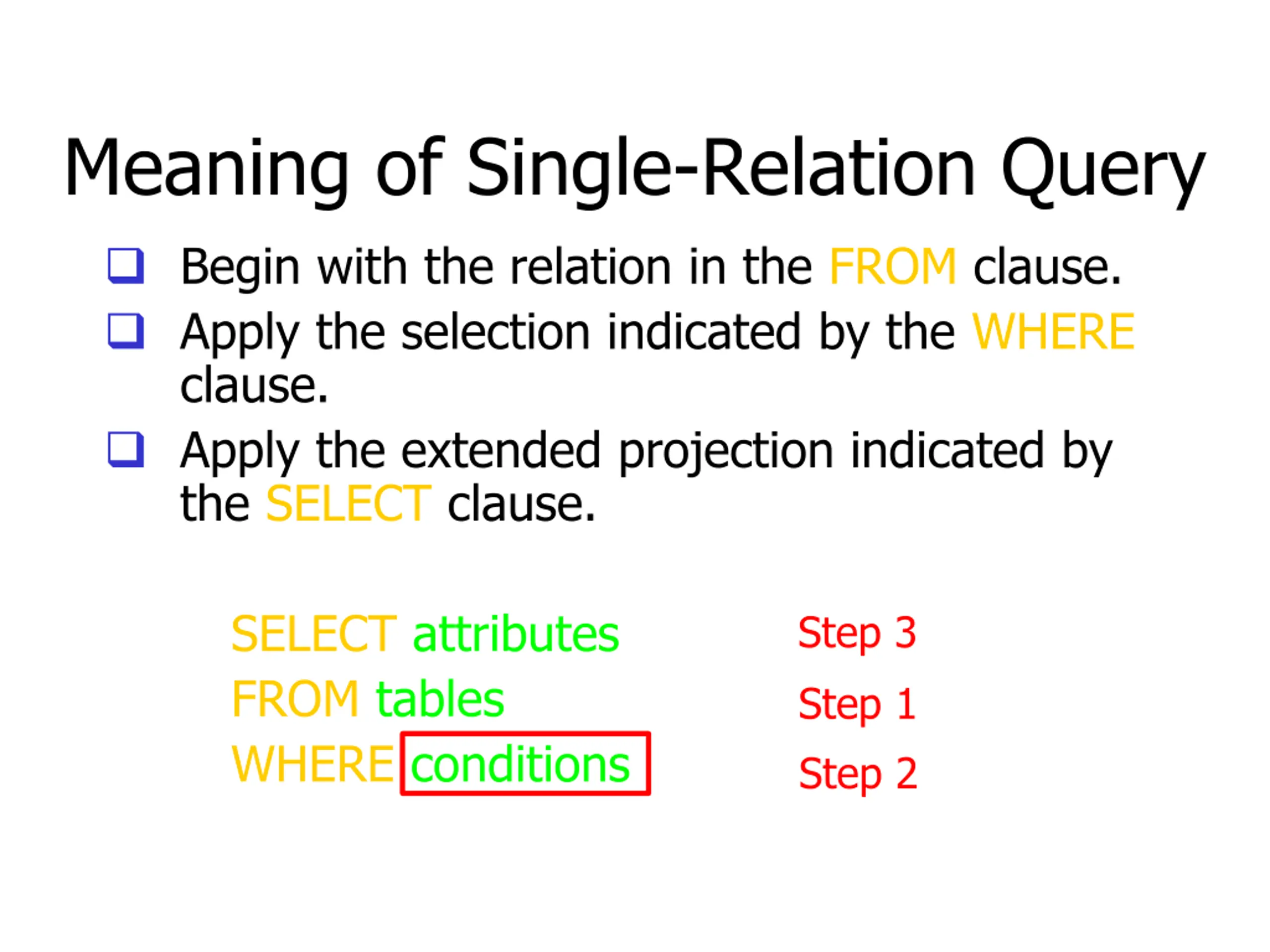 Meaning of Single-Relation Query Begin with the relation in the FROM clause. Apply the selection indicated by the WHERE clause. Apply the extended projection indicated by the SELECT clause. SELECT attributes FROM tables WHERE conditions Step 3 Step 1 Step 2