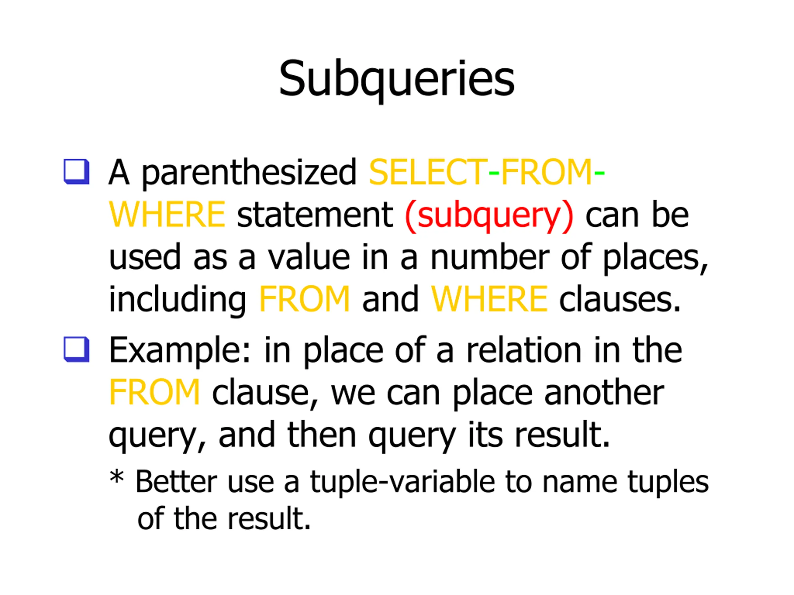 Subqueries A parenthesized SELECT-FROM- WHERE statement (subquery) can be used as a value in a number of places, including FROM and WHERE clauses.