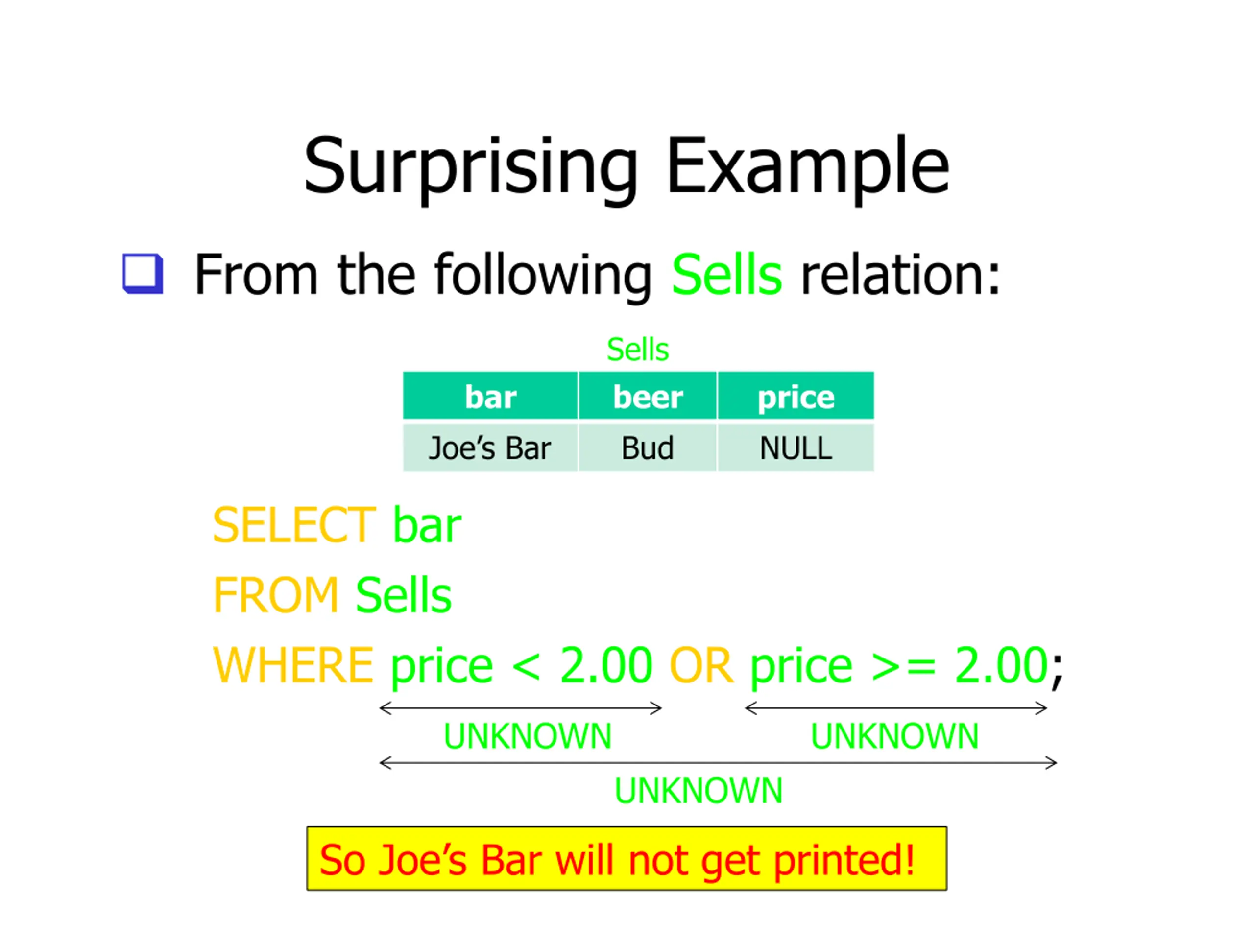 Surprising Example From the following Sells relation: Sells bar beer Bud price NULL Joe s Bar SELECT bar FROM Sells WHERE price < 2.00 OR price >= 2.00; UNKNOWN UNKNOWN UNKNOWN So Joe s Bar will not get printed!