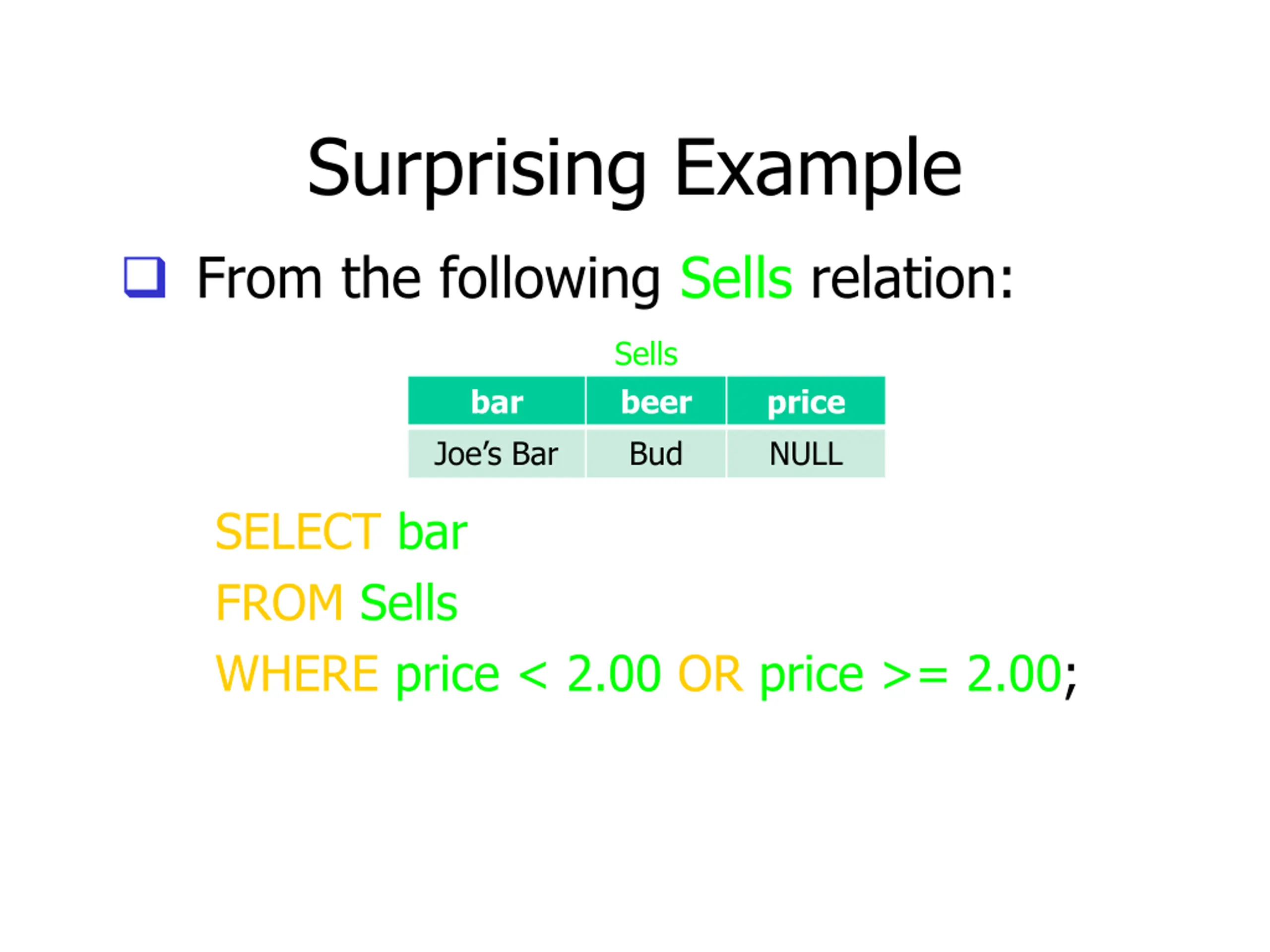 Surprising Example From the following Sells relation: Sells bar beer Bud price NULL Joe s Bar SELECT bar FROM Sells WHERE price < 2.00 OR price >= 2.00;