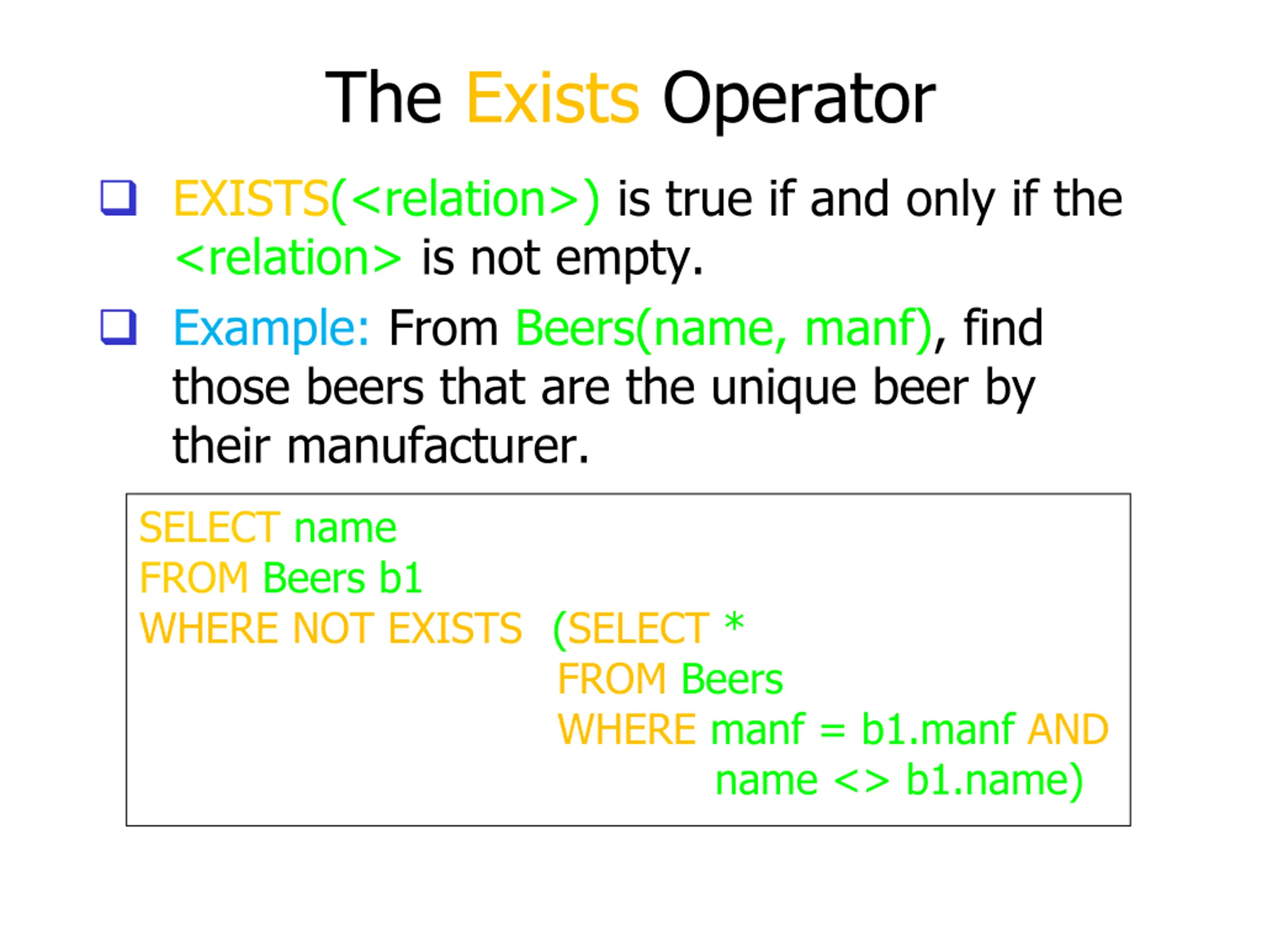 The Exists Operator EXISTS(<relation>) is true if and only if the <relation> is not empty. Example: From Beers(name, manf), find those beers that are the unique beer by their manufacturer. SELECT name FROM Beers b1 WHERE NOT EXISTS ((SELECT * FROM Beers WHERE manf = b1.manf AND name <> b1.name)