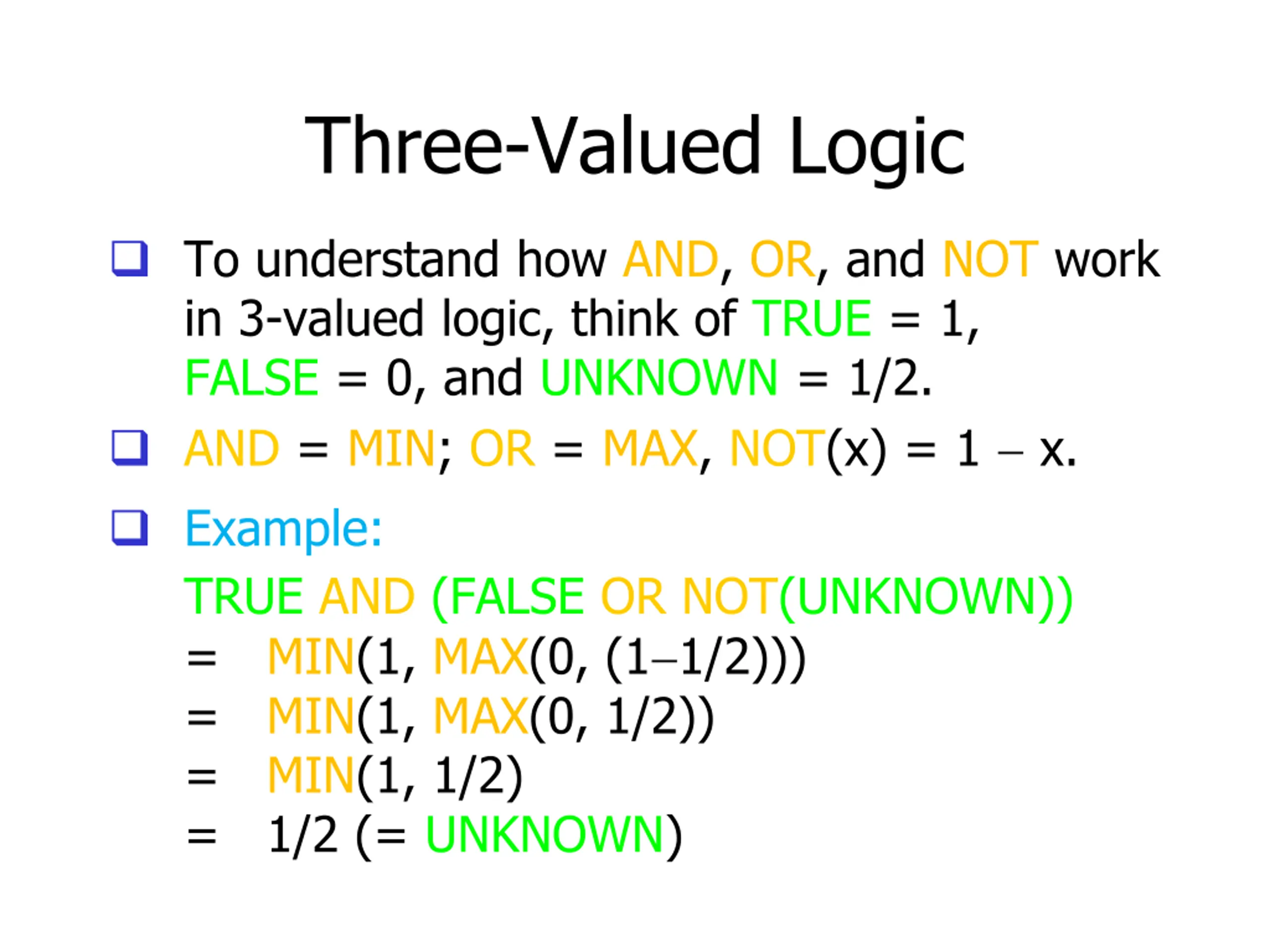 Three-Valued Logic To understand how AND, OR, and NOT work in 3-valued logic, think of TRUE = 1, FALSE = 0, and UNKNOWN = 1/2. AND = MIN; OR = MAX, NOT(x) = 1 x. Example: TRUE AND (FALSE OR NOT(UNKNOWN)) = MIN(1, MAX(0, (1 1/2))) = MIN(1, MAX(0, 1/2)) = MIN(1, 1/2) = 1/2 (= UNKNOWN)