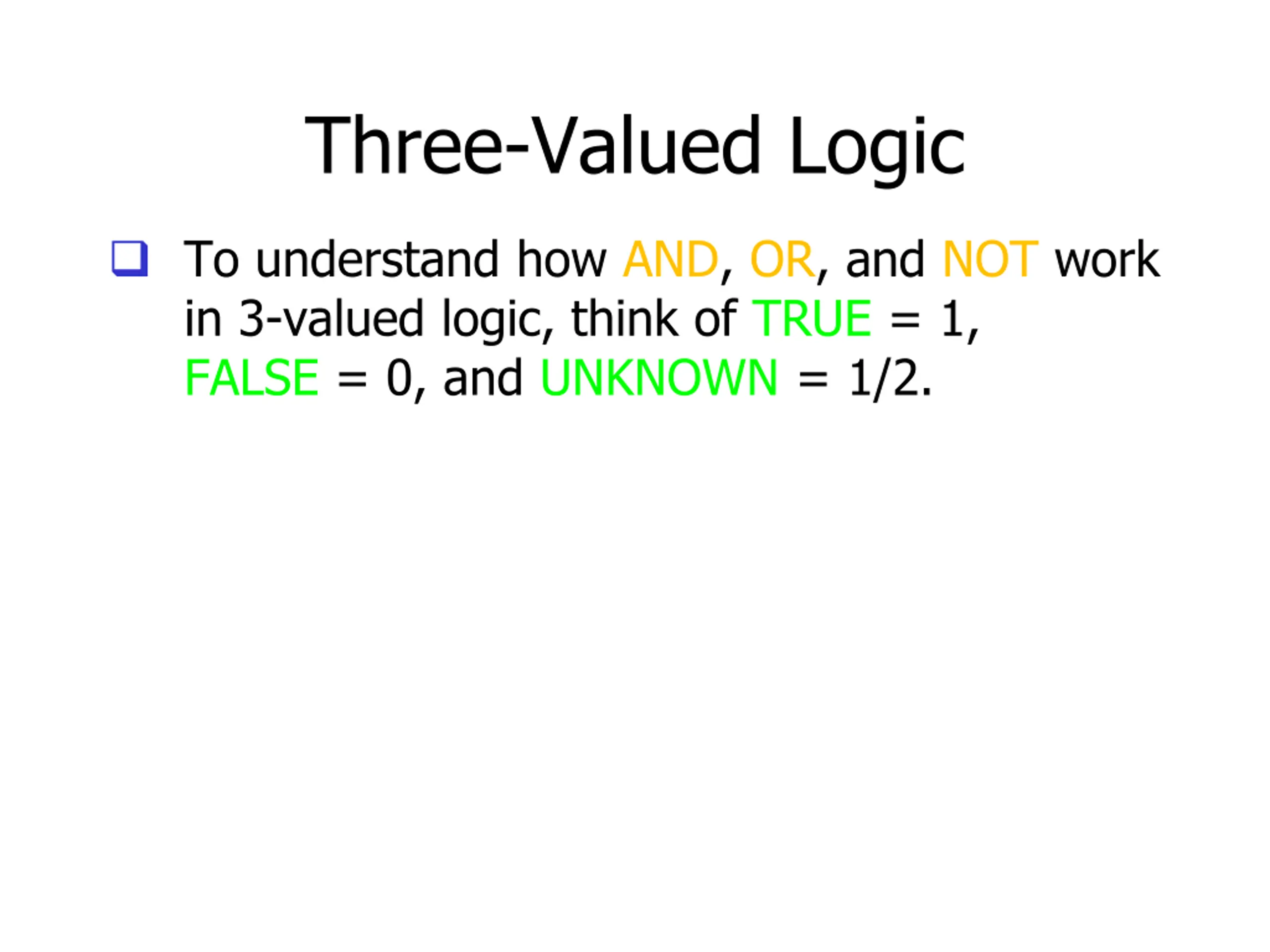Three-Valued Logic To understand how AND, OR, and NOT work in 3-valued logic, think of TRUE = 1, FALSE = 0, and UNKNOWN = 1/2.