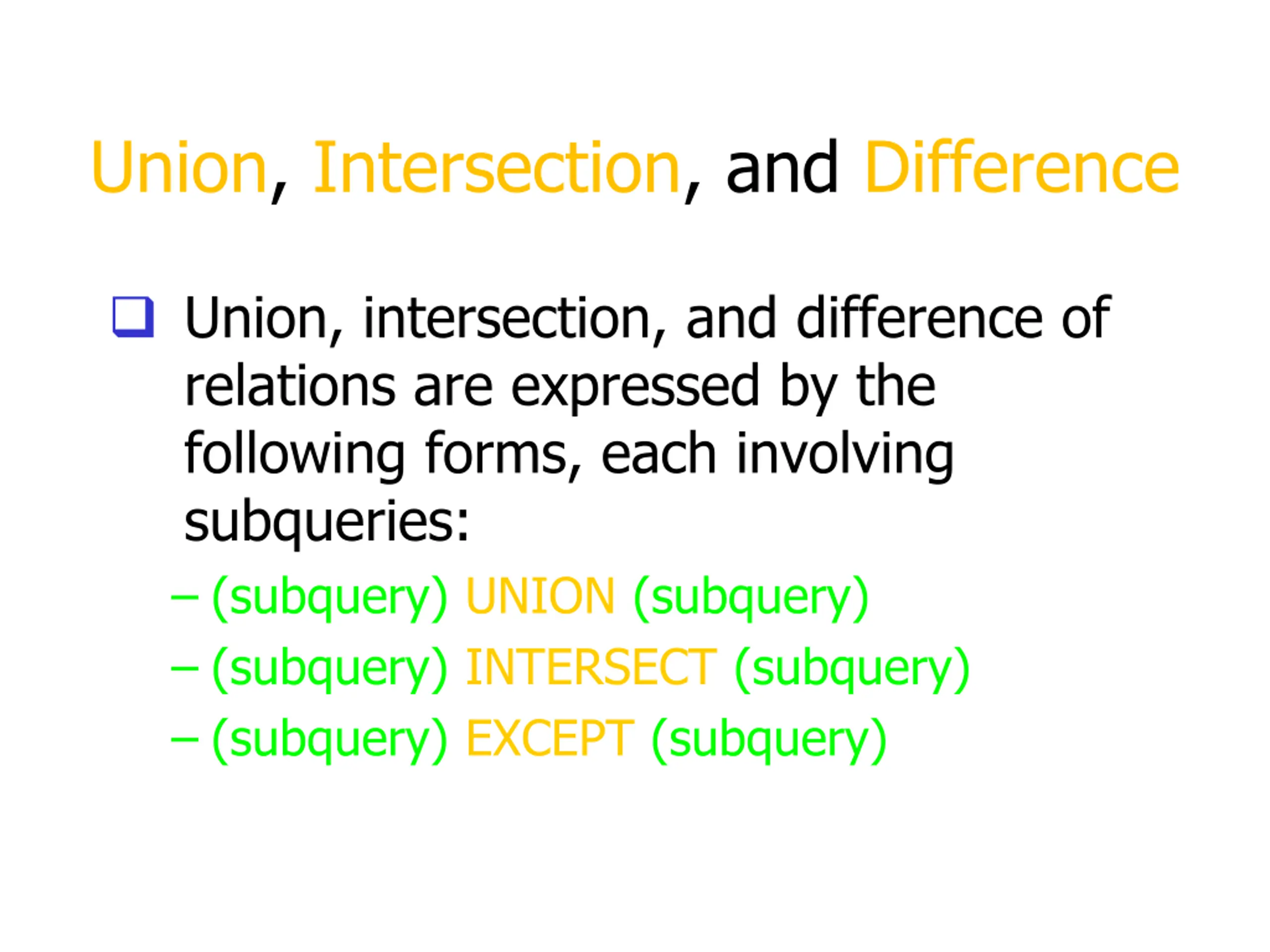 Union, Intersection, and Difference Union, intersection, and difference of relations are expressed by the following forms, each involving subqueries: (subquery) UNION (subquery) (subquery) INTERSECT (subquery) (subquery) EXCEPT (subquery)