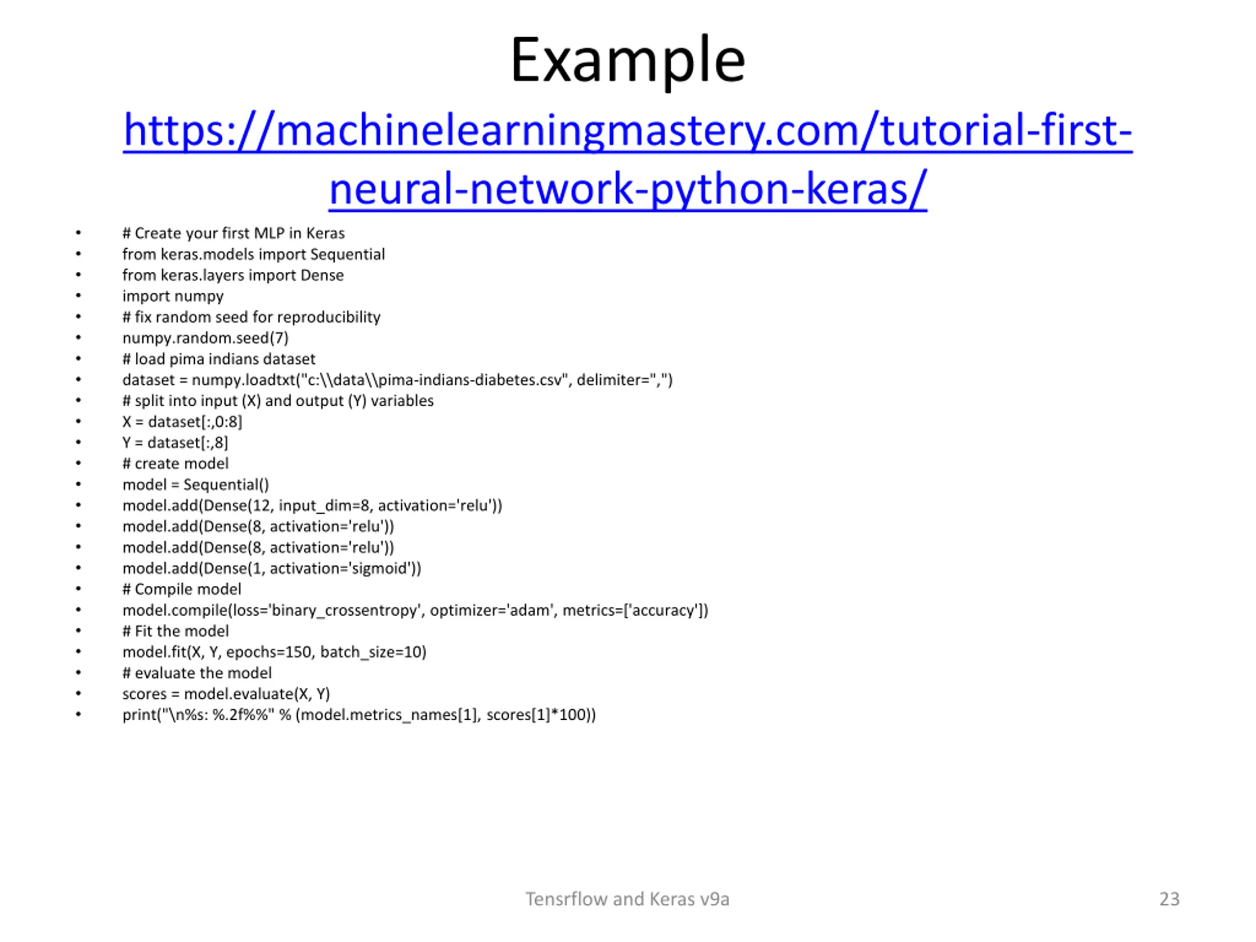 Example https://machinelearningmastery.com/tutorial-first- neural-network-python-keras/ # Create your first MLP in Keras from keras.models import Sequential from keras.layers import Dense import numpy # fix random seed for reproducibility numpy.random.seed(7) # load pima indians dataset dataset = numpy.loadtxt("c:\\data\\pima-indians-diabetes.csv", delimiter=",") # split into input (X) and output (Y) variables X = dataset[:,0:8] Y = dataset[:,8] # create model model = Sequential() model.add(Dense(12, input_dim=8, activation='relu')) model.add(Dense(8, activation='relu')) model.add(Dense(8, activation='relu')) model.add(Dense(1, activation='sigmoid')) # Compile model model.compile(loss='binary_crossentropy', optimizer='adam', metrics=['accuracy']) # Fit the model model.fit(X, Y, epochs=150, batch_size=10) # evaluate the model scores = model.evaluate(X, Y) print("\n%s: %.2f%%" % (model.metrics_names[1], scores[1]*100)) Tensrflow and Keras v9a 23