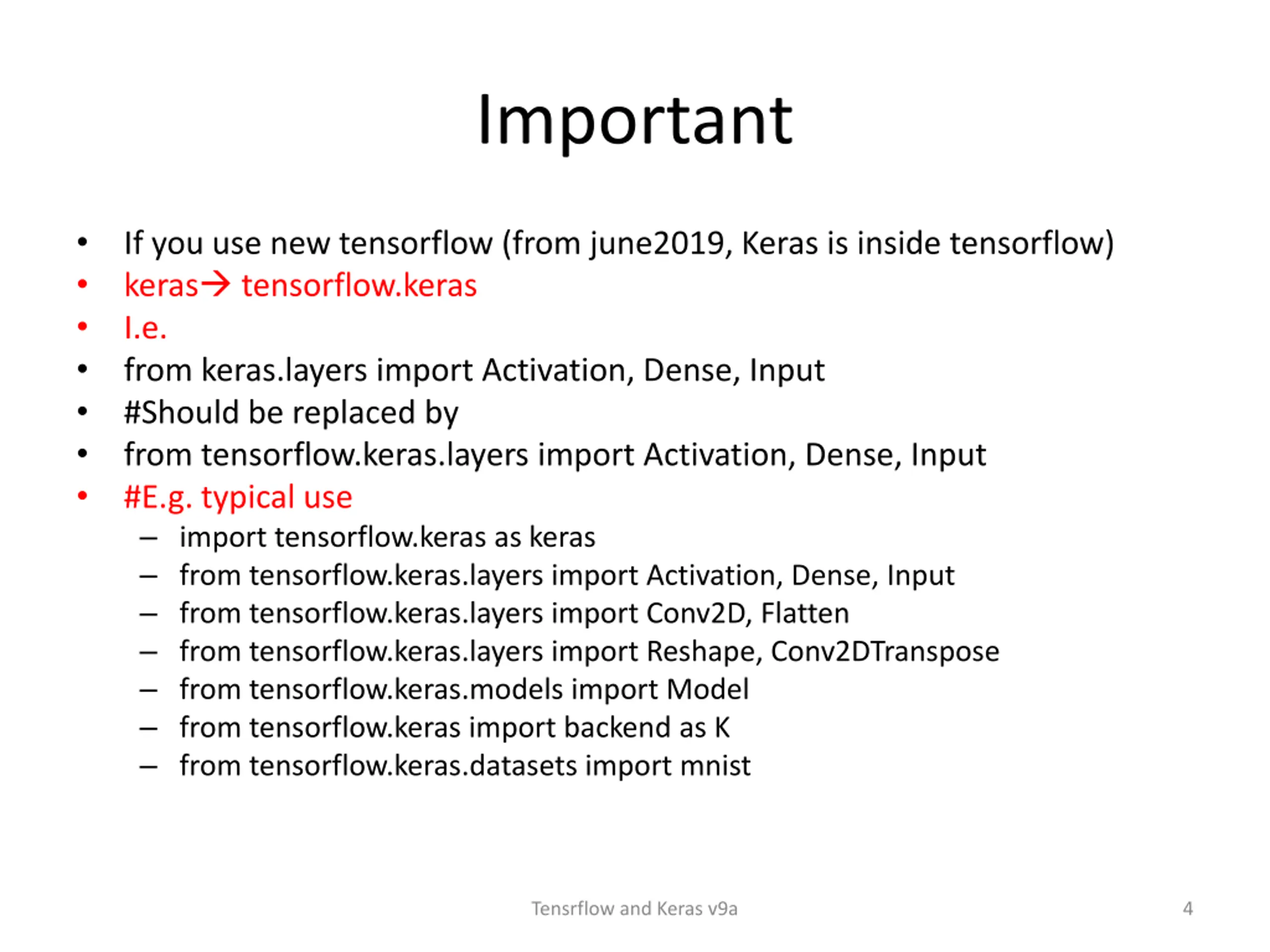 Important If you use new tensorflow (from june2019, Keras is inside tensorflow) keras tensorflow.keras I.e. from keras.layers import Activation, Dense, Input #Should be replaced by from tensorflow.keras.layers import Activation, Dense, Input #E.g. typical use import tensorflow.keras as keras from tensorflow.keras.layers import Activation, Dense, Input from tensorflow.keras.layers import Conv2D, Flatten from tensorflow.keras.layers import Reshape, Conv2DTranspose from tensorflow.keras.models import Model from tensorflow.keras import backend as K from tensorflow.keras.datasets import mnist Tensrflow and Keras v9a 4