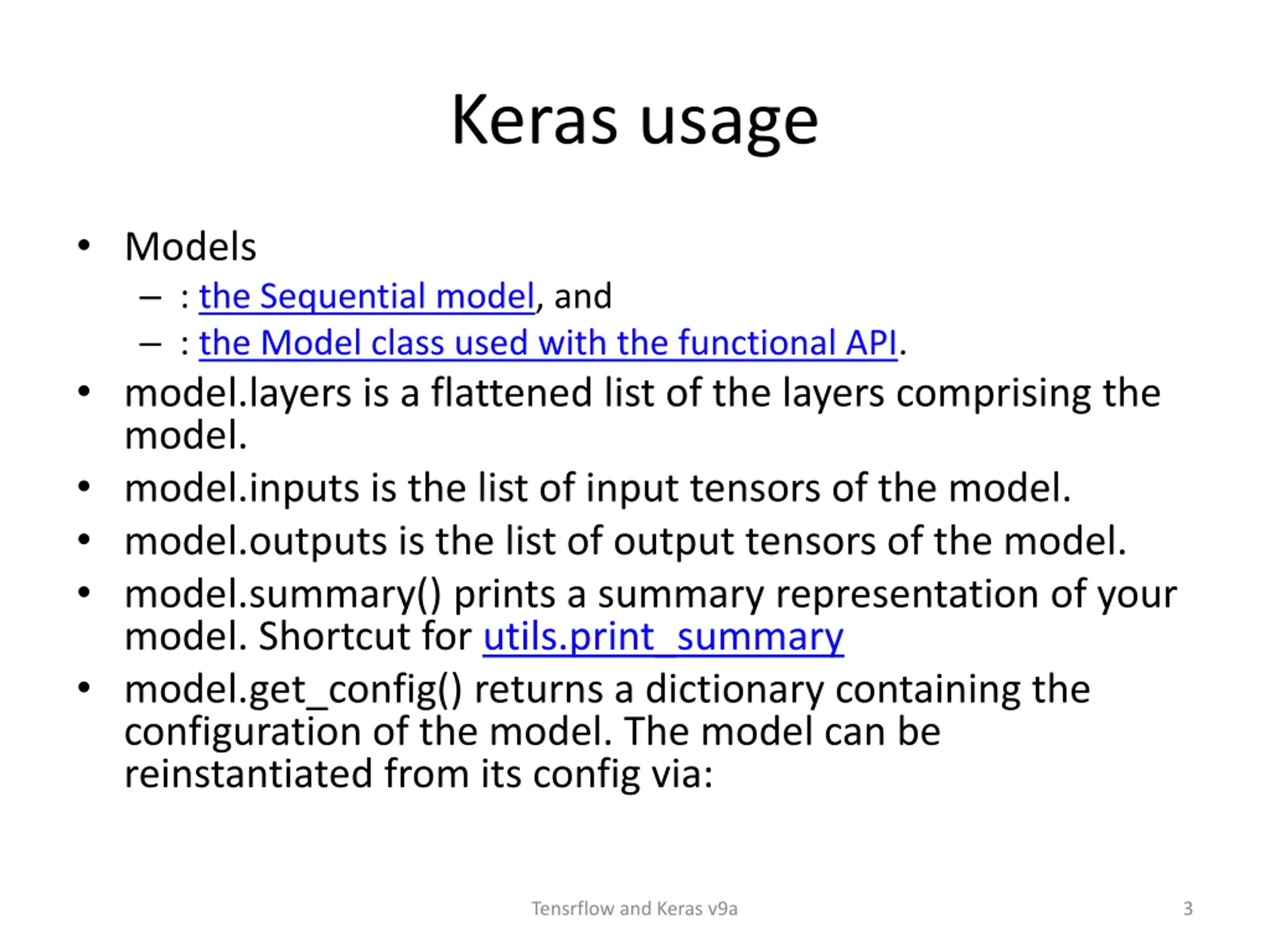 Keras usage Models : the Sequential model, and : the Model class used with the functional API. model.layers is a flattened list of the layers comprising the model. model.inputs is the list of input tensors of the model. model.outputs is the list of output tensors of the model. model.summary() prints a summary representation of your model. Shortcut for utils.print_summary model.get_config() returns a dictionary containing the configuration of the model. The model can be reinstantiated from its config via: Tensrflow and Keras v9a 3