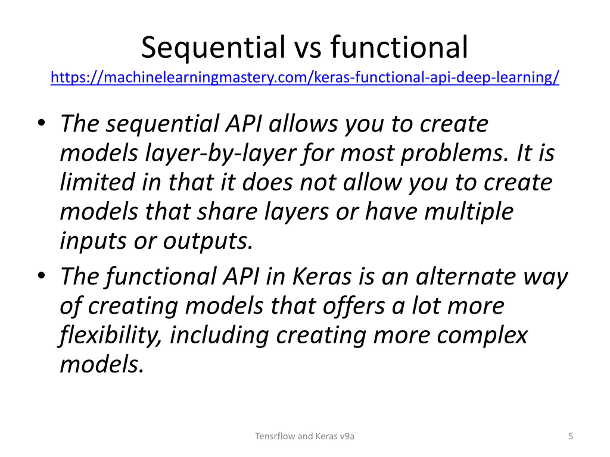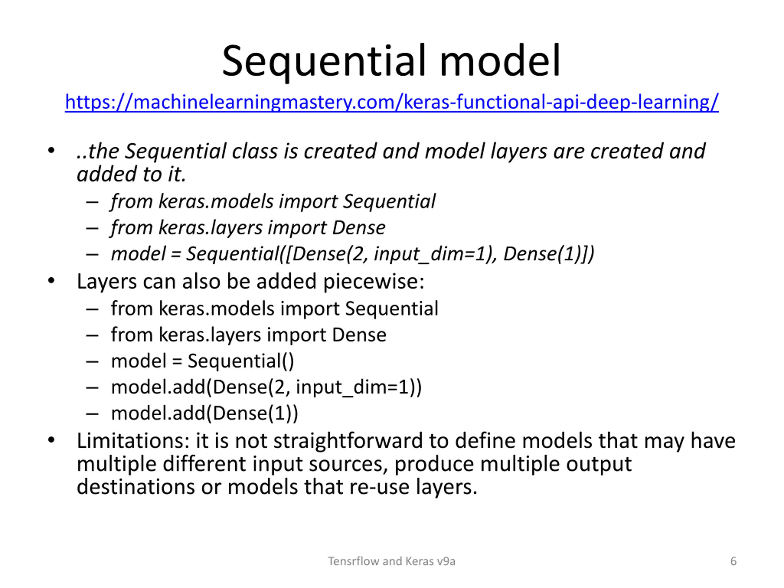 Sequential model https://machinelearningmastery.com/keras-functional-api-deep-learning/ ..the Sequential class is created and model layers are created and added to it. from keras.models import Sequential from keras.layers import Dense model = Sequential([Dense(2, input_dim=1), Dense(1)]) Layers can also be added piecewise: from keras.models import Sequential from keras.layers import Dense model = Sequential() model.add(Dense(2, input_dim=1)) model.add(Dense(1)) Limitations: it is not straightforward to define models that may have multiple different input sources, produce multiple output destinations or models that re-use layers. Tensrflow and Keras v9a 6