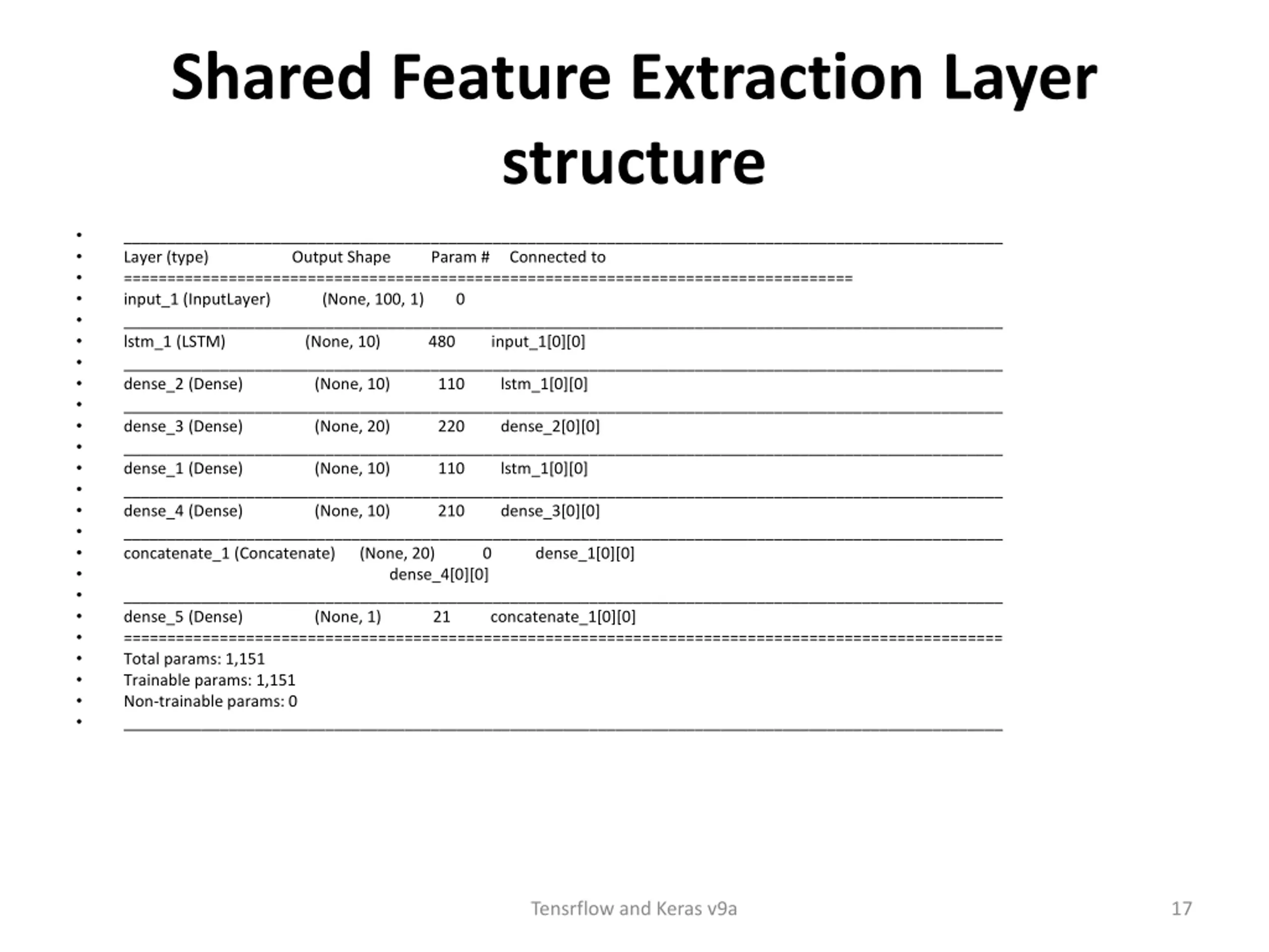 Shared Feature Extraction Layer structure ____________________________________________________________________________________________________ Layer (type) Output Shape Param # Connected to =================================================================================== input_1 (InputLayer) (None, 100, 1) 0 ____________________________________________________________________________________________________ lstm_1 (LSTM) (None, 10) 480 input_1[0][0] ____________________________________________________________________________________________________ dense_2 (Dense) (None, 10) 110 lstm_1[0][0] ____________________________________________________________________________________________________ dense_3 (Dense) (None, 20) 220 dense_2[0][0] ____________________________________________________________________________________________________ dense_1 (Dense) (None, 10) 110 lstm_1[0][0] ____________________________________________________________________________________________________ dense_4 (Dense) (None, 10) 210 dense_3[0][0] ____________________________________________________________________________________________________ concatenate_1 (Concatenate) (None, 20) 0 dense_1[0][0] dense_4[0][0] ____________________________________________________________________________________________________ dense_5 (Dense) (None, 1) 21 concatenate_1[0][0] ==================================================================================================== Total params: 1,151 Trainable params: 1,151 Non-trainable params: 0 ____________________________________________________________________________________________________ Tensrflow and Keras v9a 17