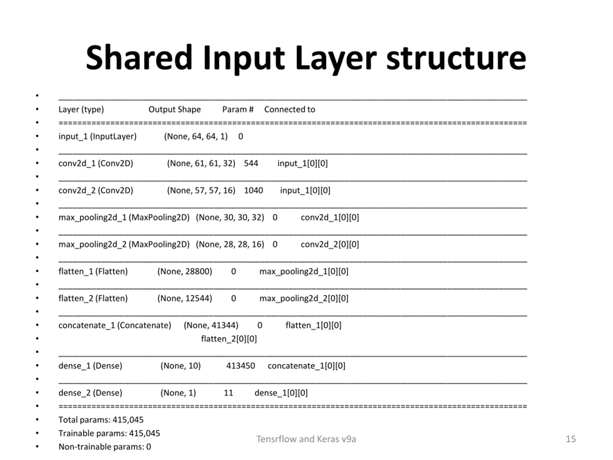 Shared Input Layer structure ____________________________________________________________________________________________________ Layer (type) Output Shape Param # Connected to ==================================================================================================== input_1 (InputLayer) (None, 64, 64, 1) 0 ____________________________________________________________________________________________________ conv2d_1 (Conv2D) (None, 61, 61, 32) 544 input_1[0][0] ____________________________________________________________________________________________________ conv2d_2 (Conv2D) (None, 57, 57, 16) 1040 input_1[0][0] ____________________________________________________________________________________________________ max_pooling2d_1 (MaxPooling2D) (None, 30, 30, 32) 0 conv2d_1[0][0] ____________________________________________________________________________________________________ max_pooling2d_2 (MaxPooling2D) (None, 28, 28, 16) 0 conv2d_2[0][0] ____________________________________________________________________________________________________ flatten_1 (Flatten) (None, 28800) 0 max_pooling2d_1[0][0] ____________________________________________________________________________________________________ flatten_2 (Flatten) (None, 12544) 0 max_pooling2d_2[0][0] ____________________________________________________________________________________________________ concatenate_1 (Concatenate) (None, 41344) 0 flatten_1[0][0] flatten_2[0][0] ____________________________________________________________________________________________________ dense_1 (Dense) (None, 10) 413450 concatenate_1[0][0] ____________________________________________________________________________________________________ dense_2 (Dense) (None, 1) 11 dense_1[0][0] ==================================================================================================== Total params: 415,045 Trainable params: 415,045 Non-trainable params: 0 Tensrflow and Keras v9a 15