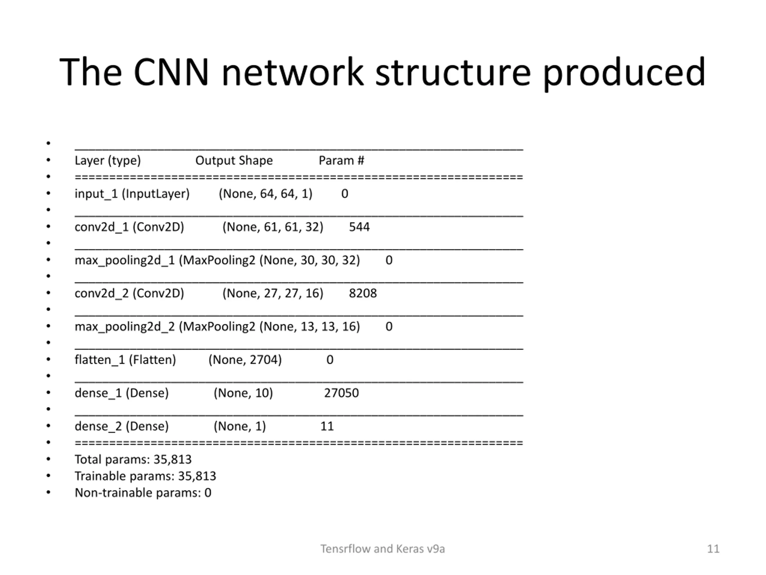 The CNN network structure produced _________________________________________________________________ Layer (type) Output Shape Param # ================================================================= input_1 (InputLayer) (None, 64, 64, 1) 0 _________________________________________________________________ conv2d_1 (Conv2D) (None, 61, 61, 32) 544 _________________________________________________________________ max_pooling2d_1 (MaxPooling2 (None, 30, 30, 32) 0 _________________________________________________________________ conv2d_2 (Conv2D) (None, 27, 27, 16) 8208 _________________________________________________________________ max_pooling2d_2 (MaxPooling2 (None, 13, 13, 16) 0 _________________________________________________________________ flatten_1 (Flatten) (None, 2704) 0 _________________________________________________________________ dense_1 (Dense) (None, 10) 27050 _________________________________________________________________ dense_2 (Dense) (None, 1) 11 ================================================================= Total params: 35,813 Trainable params: 35,813 Non-trainable params: 0 Tensrflow and Keras v9a 11