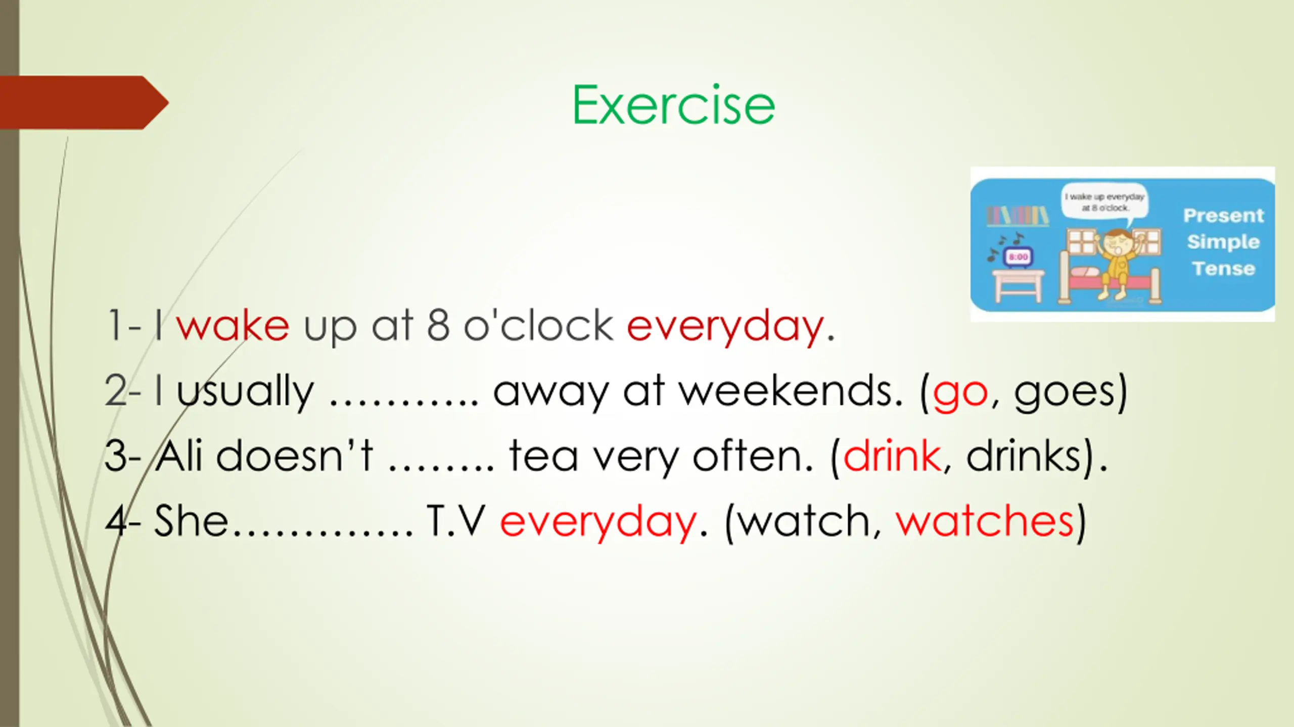 Exercise 1- I wake up at 8 o'clock everyday. 2- I usually .. away at weekends. (go, goes) 3- Ali doesn t .. tea very often. (drink, drinks). 4- She . T.V everyday. (watch, watches)
