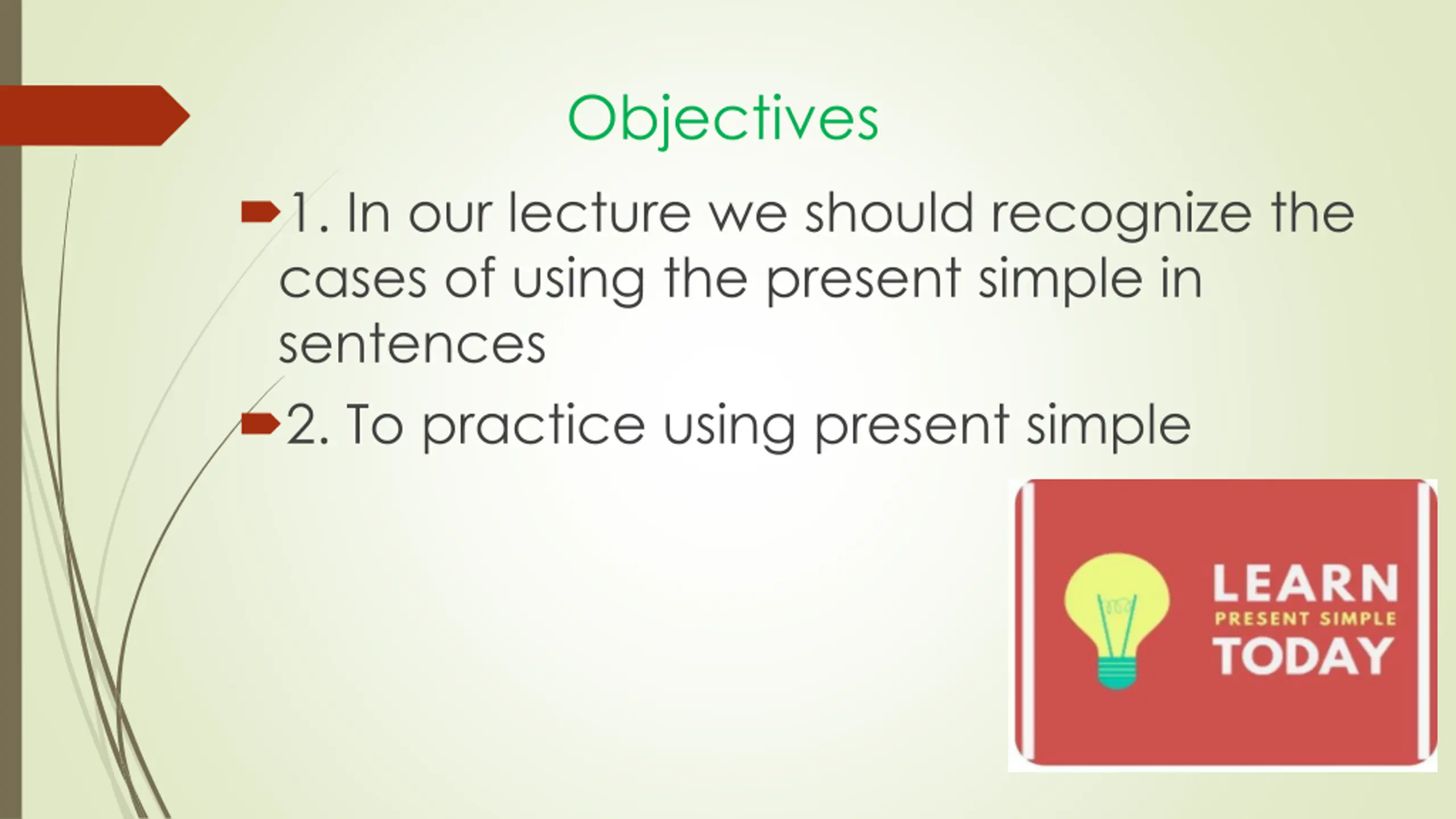 Objectives 1. In our lecture we should recognize the cases of using the present simple in sentences 2. To practice using present simple
