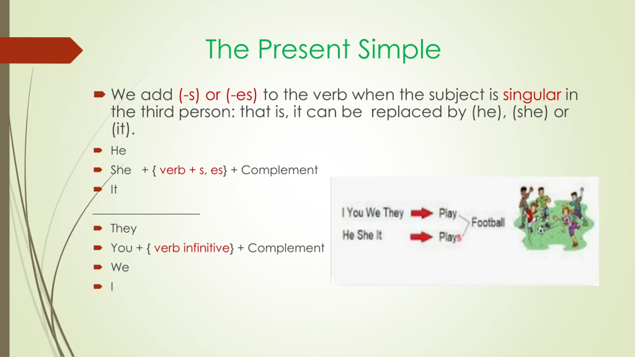 The Present Simple We add (-s) or (-es) to the verb when the subject is singular in the third person: that is, it can be replaced by (he), (she) or (it). He She + { verb + s, es} + Complement It __________________ They You + { verb infinitive} + Complement We I