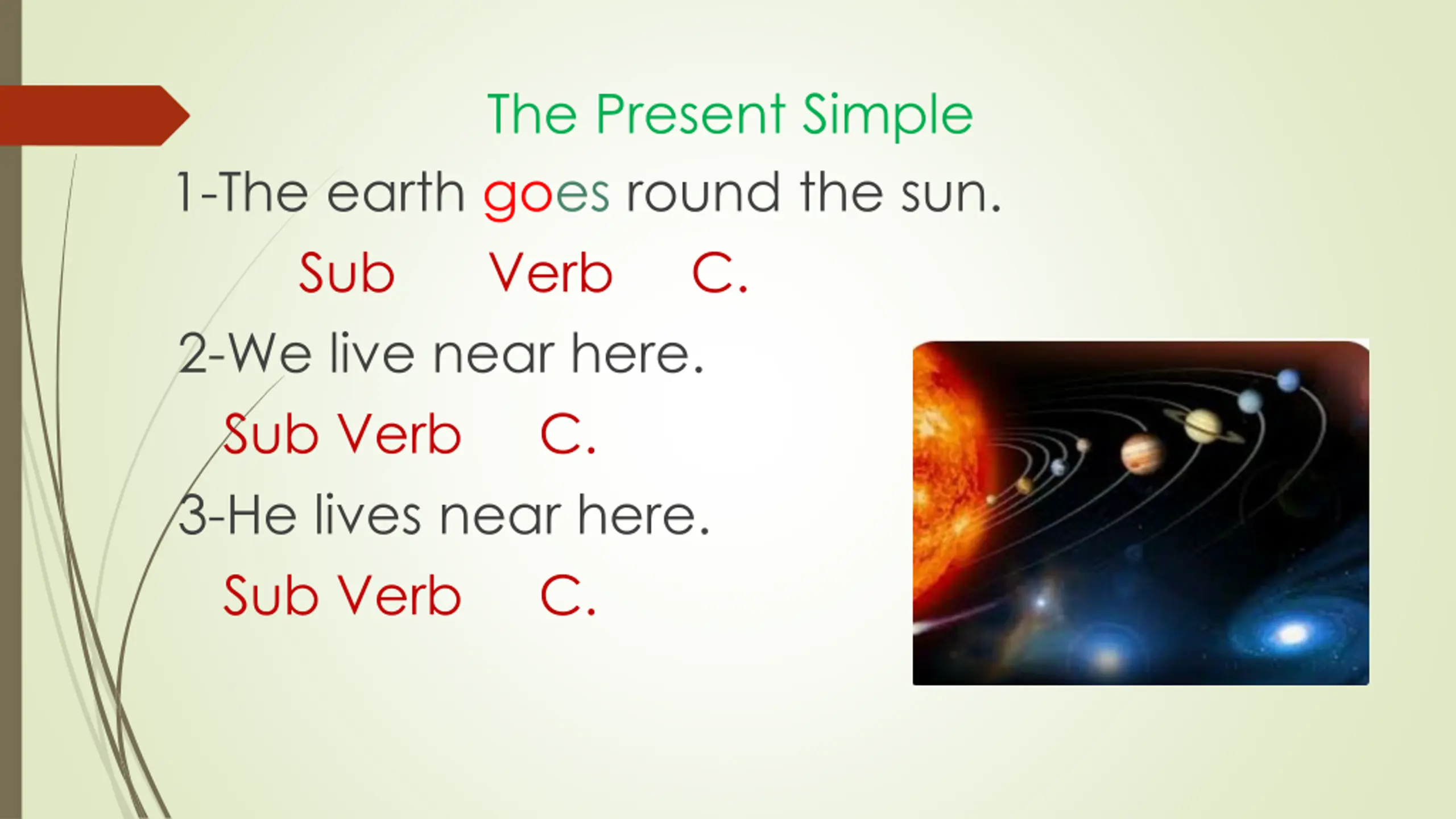 The Present Simple 1-The earth goes round the sun. Sub Verb C. 2-We live near here. Sub Verb C. 3-He lives near here. Sub Verb C.