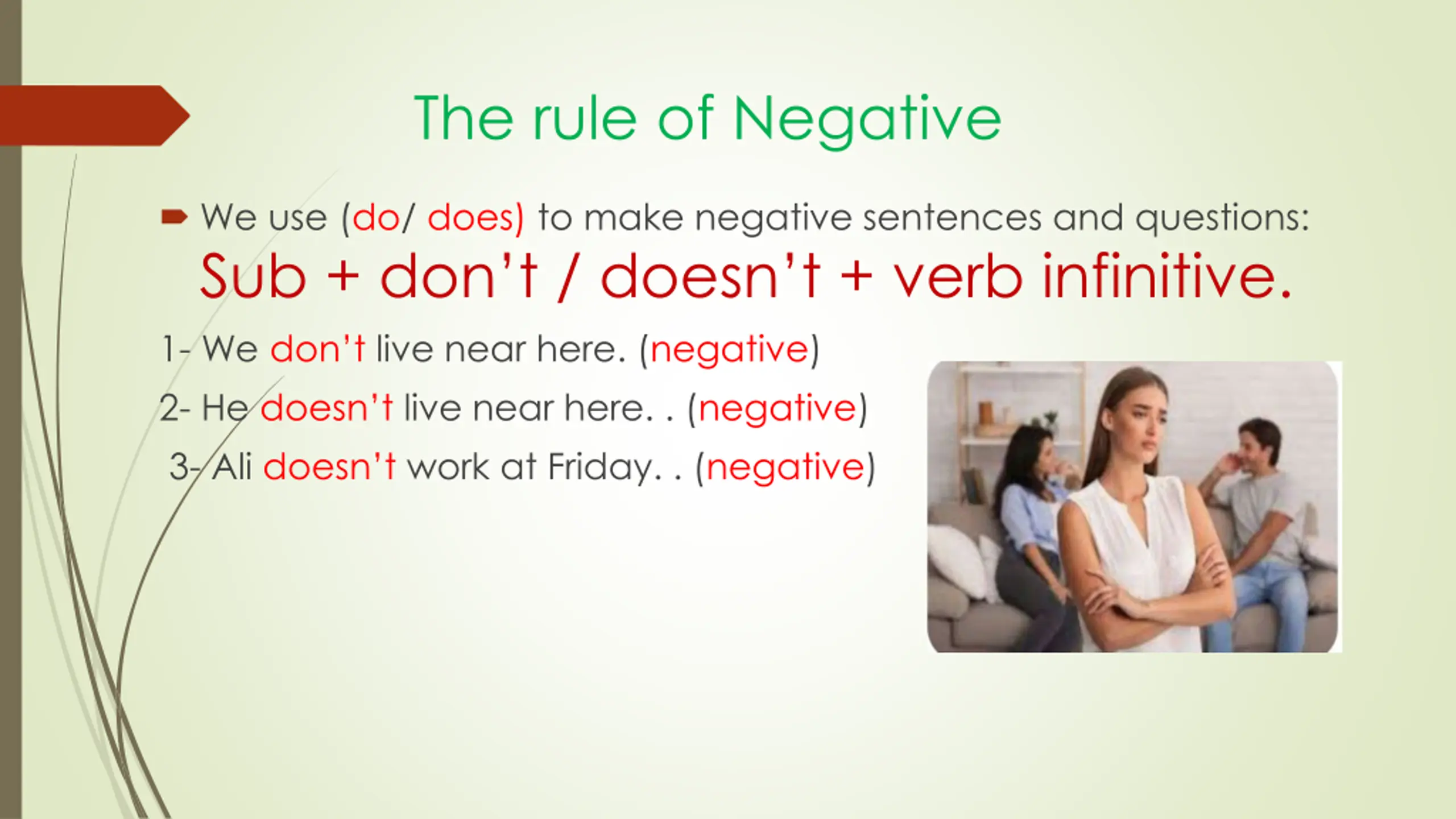 The rule of Negative We use (do/ does) to make negative sentences and questions: Sub + don t / doesn t + verb infinitive. 1- We don t live near here. (negative) 2- He doesn t live near here. . (negative) 3- Ali doesn t work at Friday. . (negative)