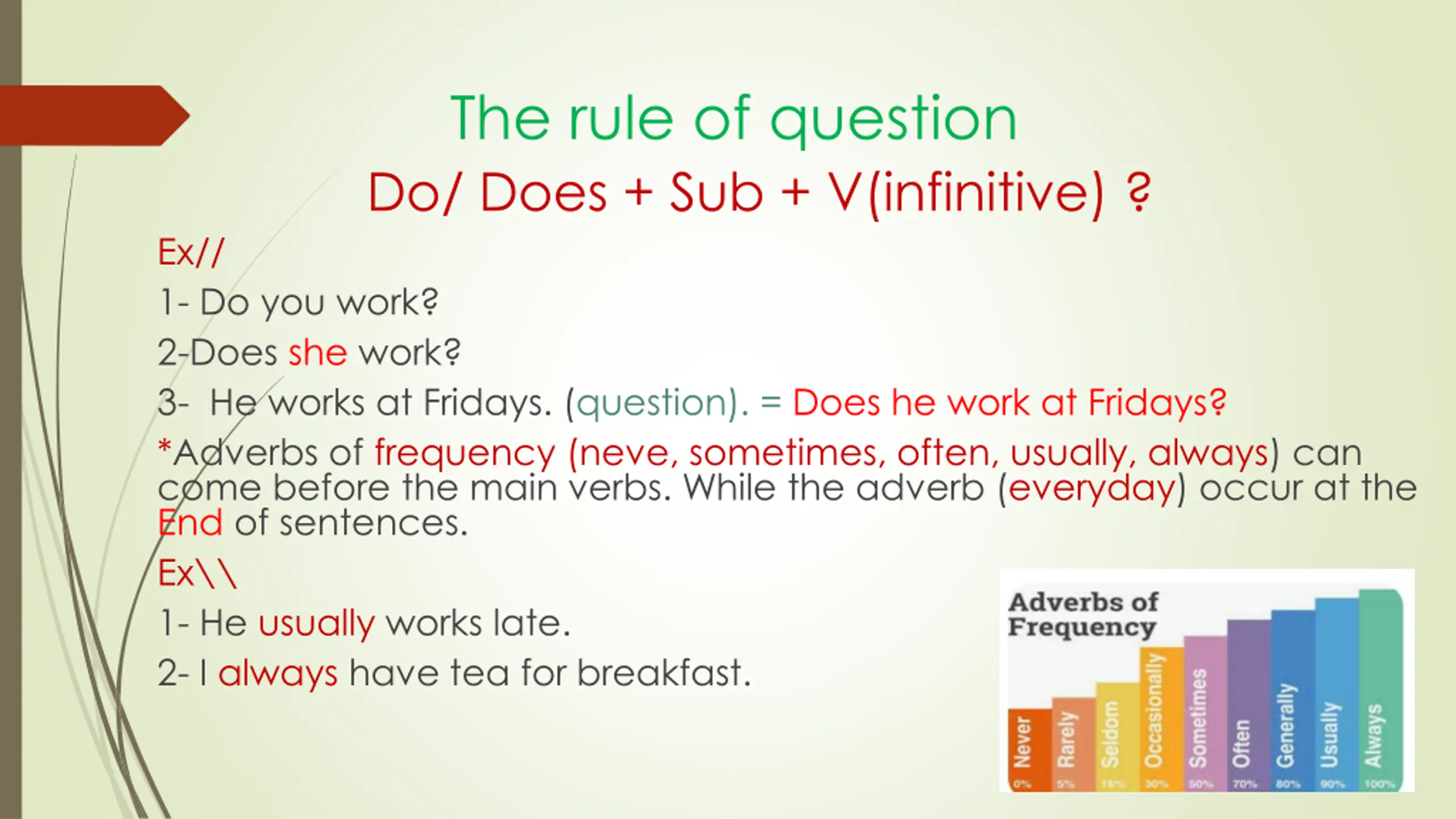 The rule of question Do/ Does + Sub + V(infinitive) ? Ex// 1- Do you work? 2-Does she work? 3- He works at Fridays. (question). = Does he work at Fridays? *Adverbs of frequency (neve, sometimes, often, usually, always) can come before the main verbs. While the adverb (everyday) occur at the End of sentences. Ex\\ 1- He usually works late. 2- I always have tea for breakfast.