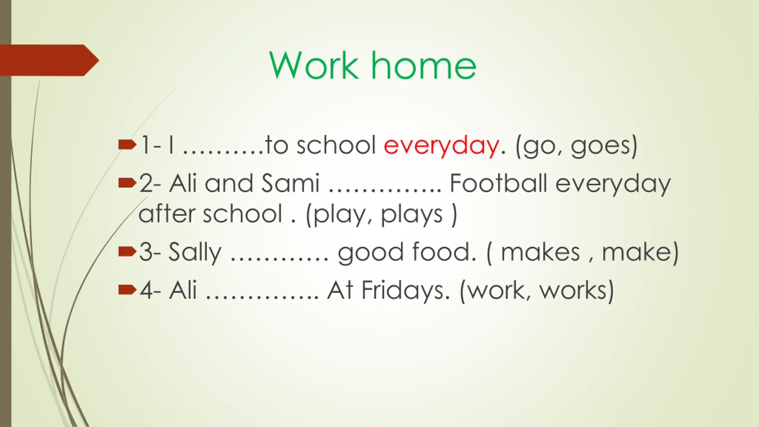 Work home 1- I .to school everyday. (go, goes) 2- Ali and Sami .. Football everyday after school . (play, plays ) 3- Sally good food. ( makes , make) 4- Ali .. At Fridays. (work, works)