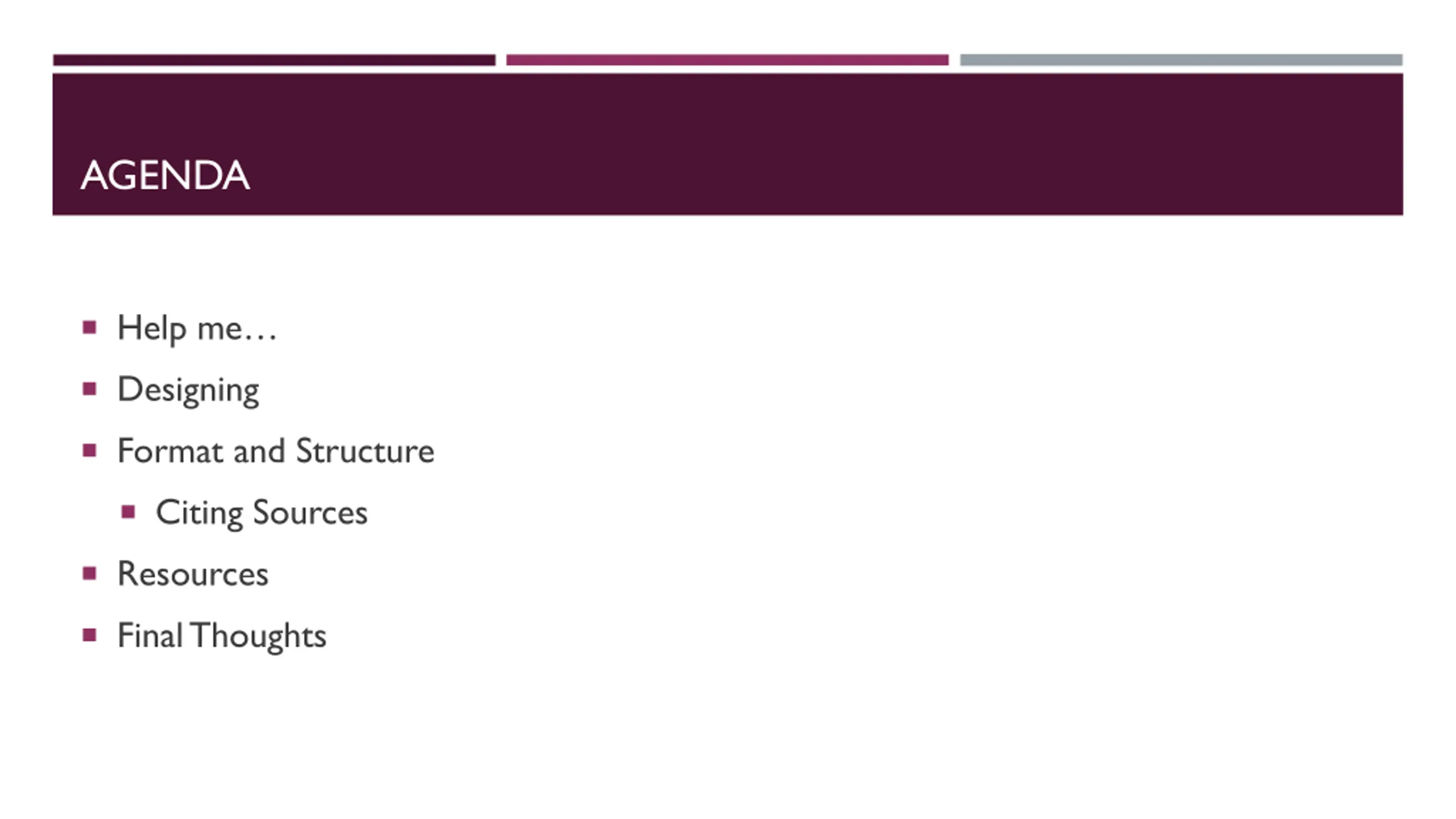 AGENDA Help me Designing Format and Structure Citing Sources Resources Final Thoughts