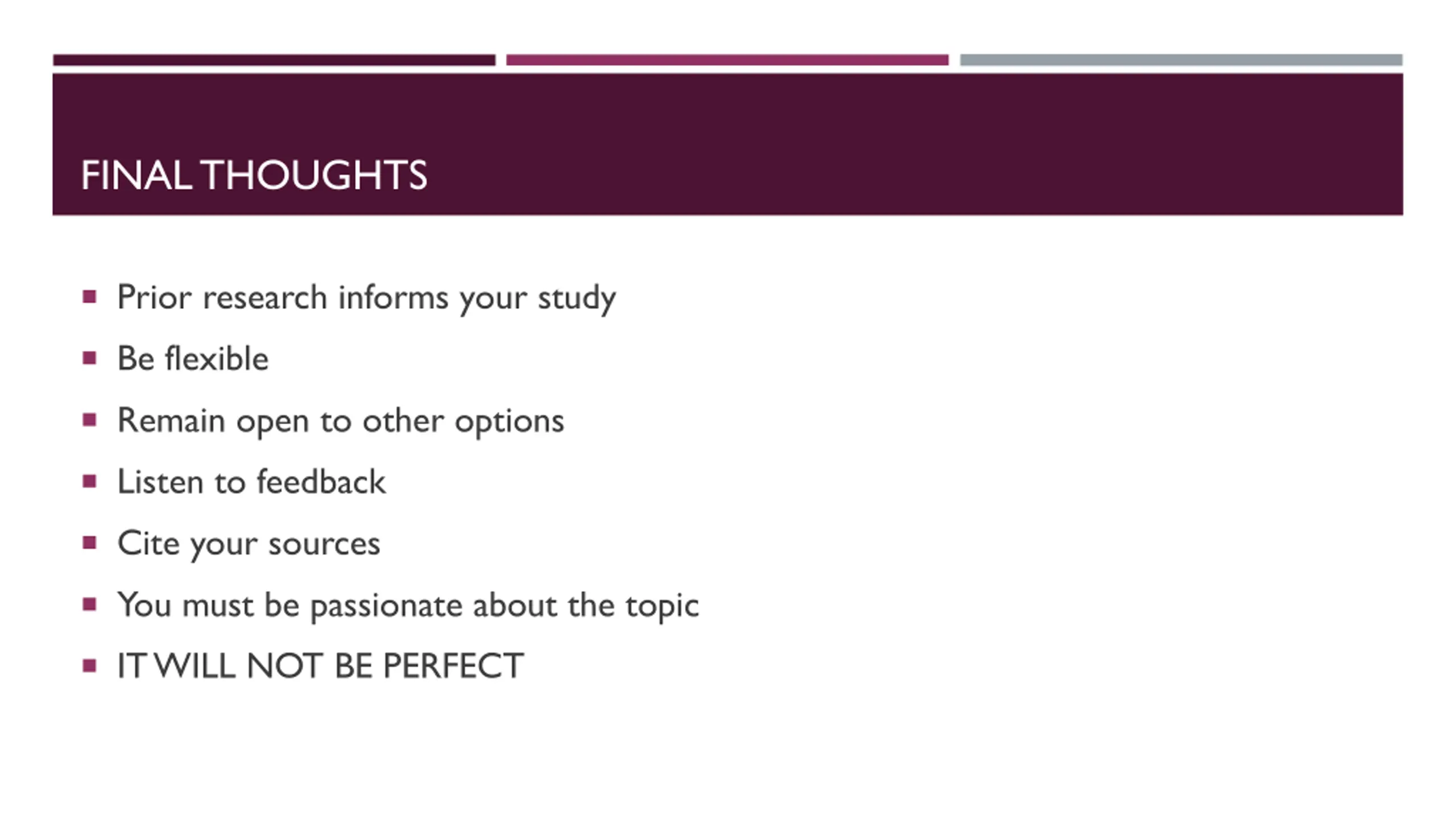 FINAL THOUGHTS Prior research informs your study Be flexible Remain open to other options Listen to feedback Cite your sources You must be passionate about the topic IT WILL NOT BE PERFECT