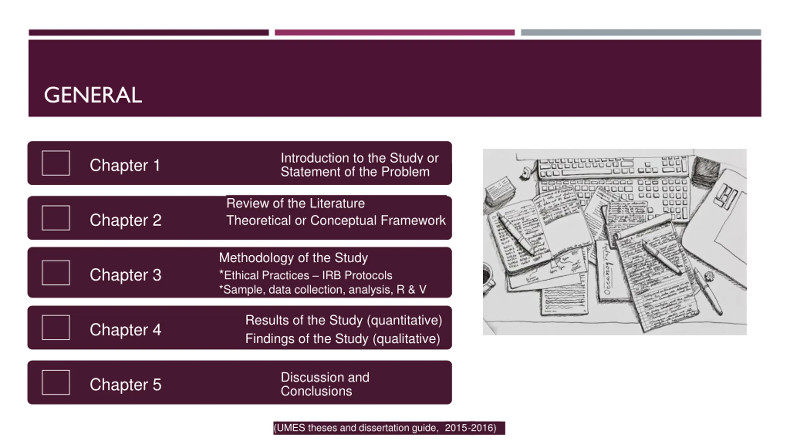 GENERAL Introduction to the Study or Statement of the Problem Chapter 1 Review of the Literature Theoretical or Conceptual Framework Chapter 2 Methodology of the Study *Ethical Practices IRB Protocols *Sample, data collection, analysis, R & V Chapter 3 Results of the Study (quantitative) Findings of the Study (qualitative) Chapter 4 Discussion and Conclusions Chapter 5 (UMES theses and dissertation guide, 2015-2016)