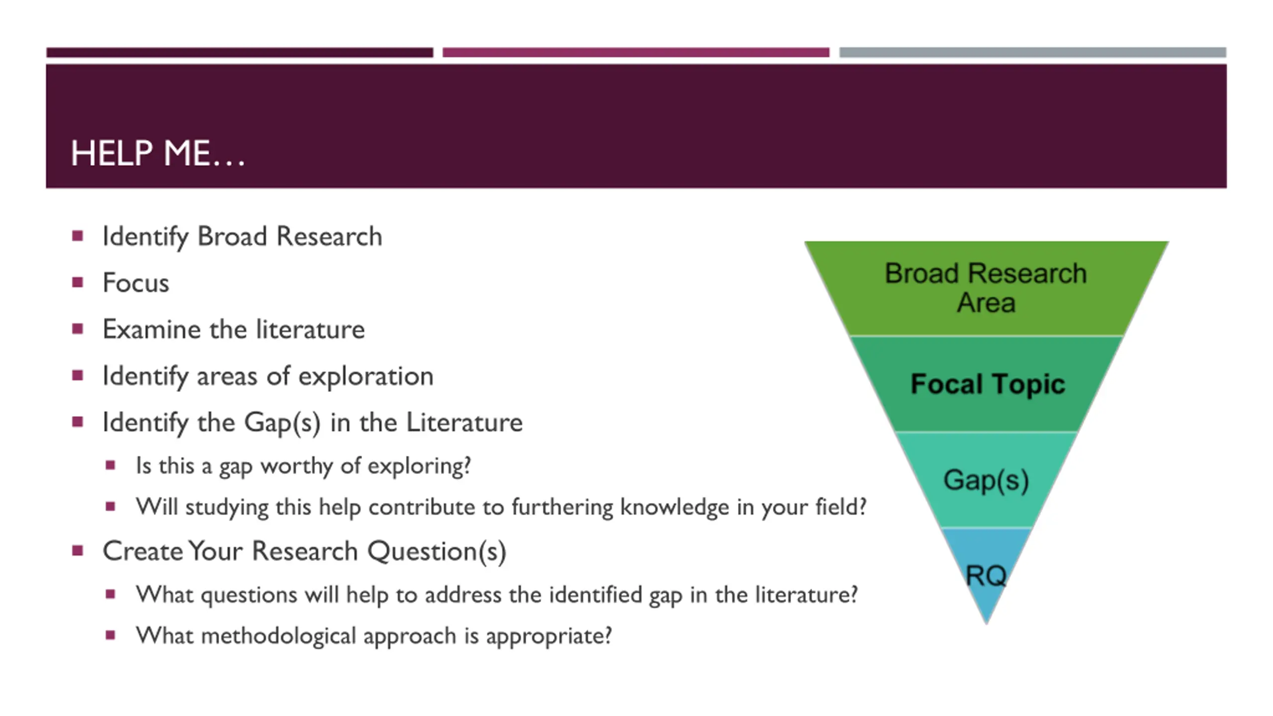 HELP ME Identify Broad Research Focus Examine the literature Identify areas of exploration Identify the Gap(s) in the Literature Is this a gap worthy of exploring? Will studying this help contribute to furthering knowledge in your field? Create Your Research Question(s) What questions will help to address the identified gap in the literature? What methodological approach is appropriate?