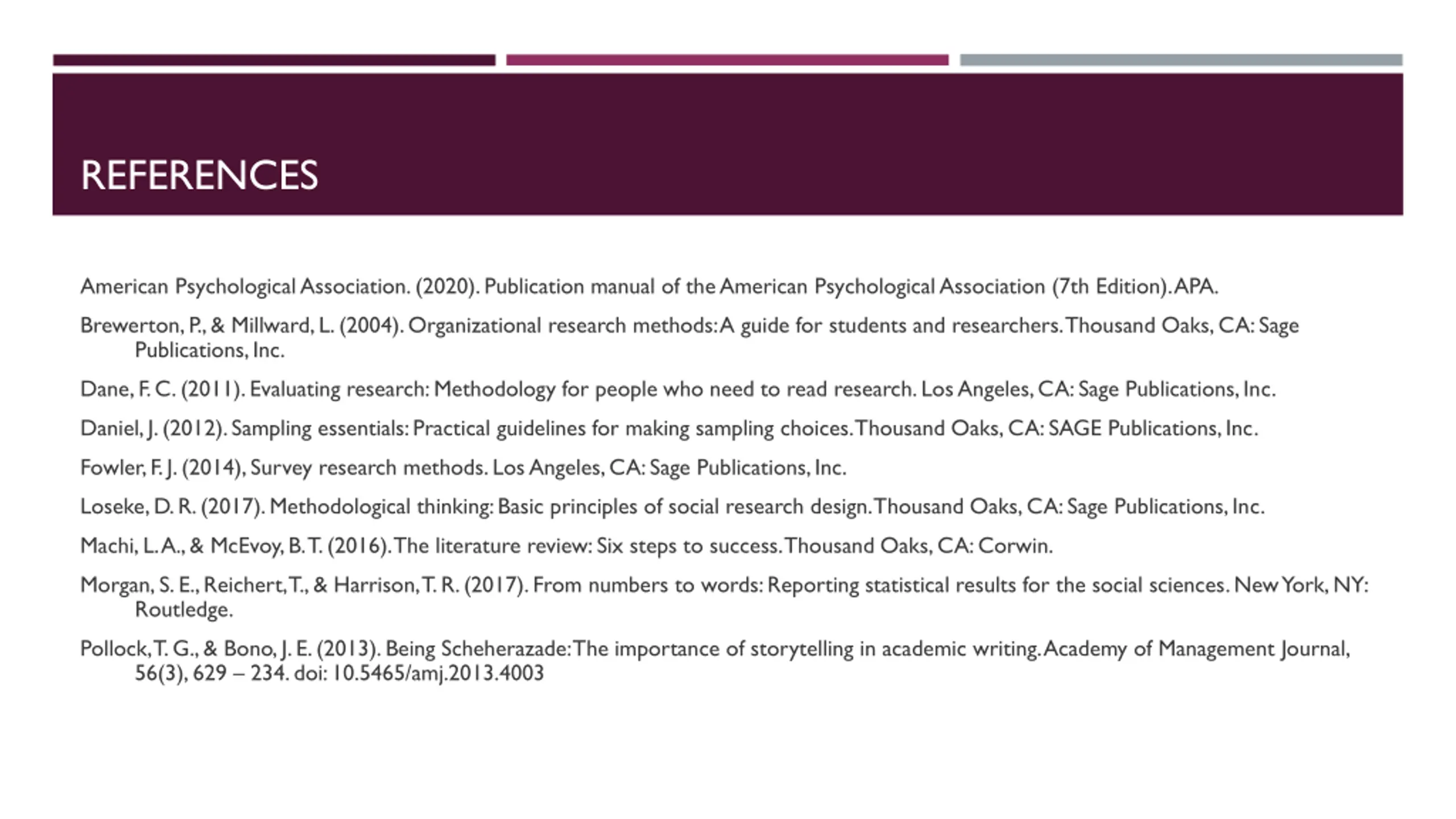 REFERENCES American Psychological Association. (2020). Publication manual of the American Psychological Association (7th Edition). APA. Brewerton, P., & Millward, L. (2004). Organizational research methods: A guide for students and researchers. Thousand Oaks, CA: Sage Publications, Inc. Dane, F. C. (2011). Evaluating research: Methodology for people who need to read research. Los Angeles, CA: Sage Publications, Inc. Daniel, J. (2012). Sampling essentials: Practical guidelines for making sampling choices. Thousand Oaks, CA: SAGE Publications, Inc. Fowler, F. J. (2014), Survey research methods. Los Angeles, CA: Sage Publications, Inc. Loseke, D. R. (2017). Methodological thinking: Basic principles of social research design. Thousand Oaks, CA: Sage Publications, Inc. Machi, L. A., & McEvoy, B. T. (2016). The literature review: Six steps to success. Thousand Oaks, CA: Corwin. Morgan, S. E., Reichert, T., & Harrison, T. R. (2017). From numbers to words: Reporting statistical results for the social sciences. New York, NY: Routledge. Pollock, T. G., & Bono, J. E. (2013). Being Scheherazade: The importance of storytelling in academic writing. Academy of Management Journal, 56(3), 629 234. doi: 10.5465/amj.2013.4003