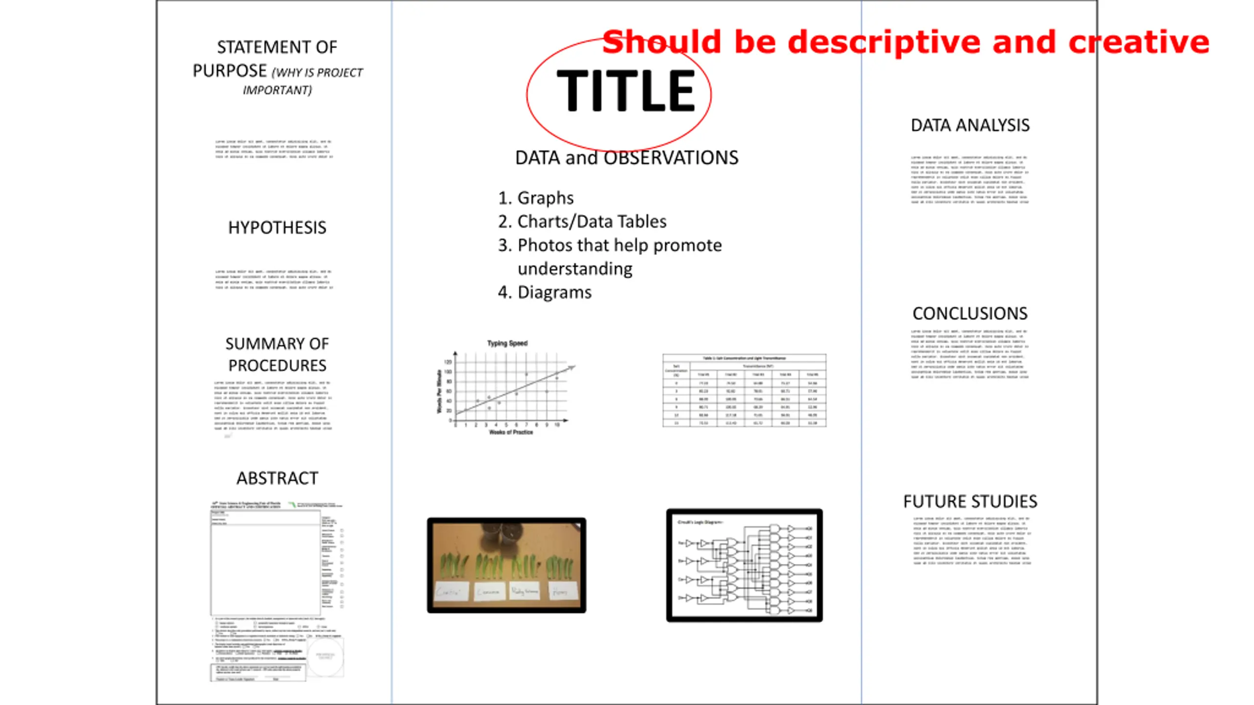 STATEMENT OF PURPOSE (WHY IS PROJECT IMPORTANT) TITLE DATA ANALYSIS DATA and OBSERVATIONS 1. Graphs 2. Charts/Data Tables 3. Photos that help promote understanding 4. Diagrams Experimental procedures should be outlined in chronological order. Be clear. HYPOTHESIS CONCLUSIONS SUMMARY OF PROCEDURES ABSTRACT FUTURE STUDIES (OPTIONAL)