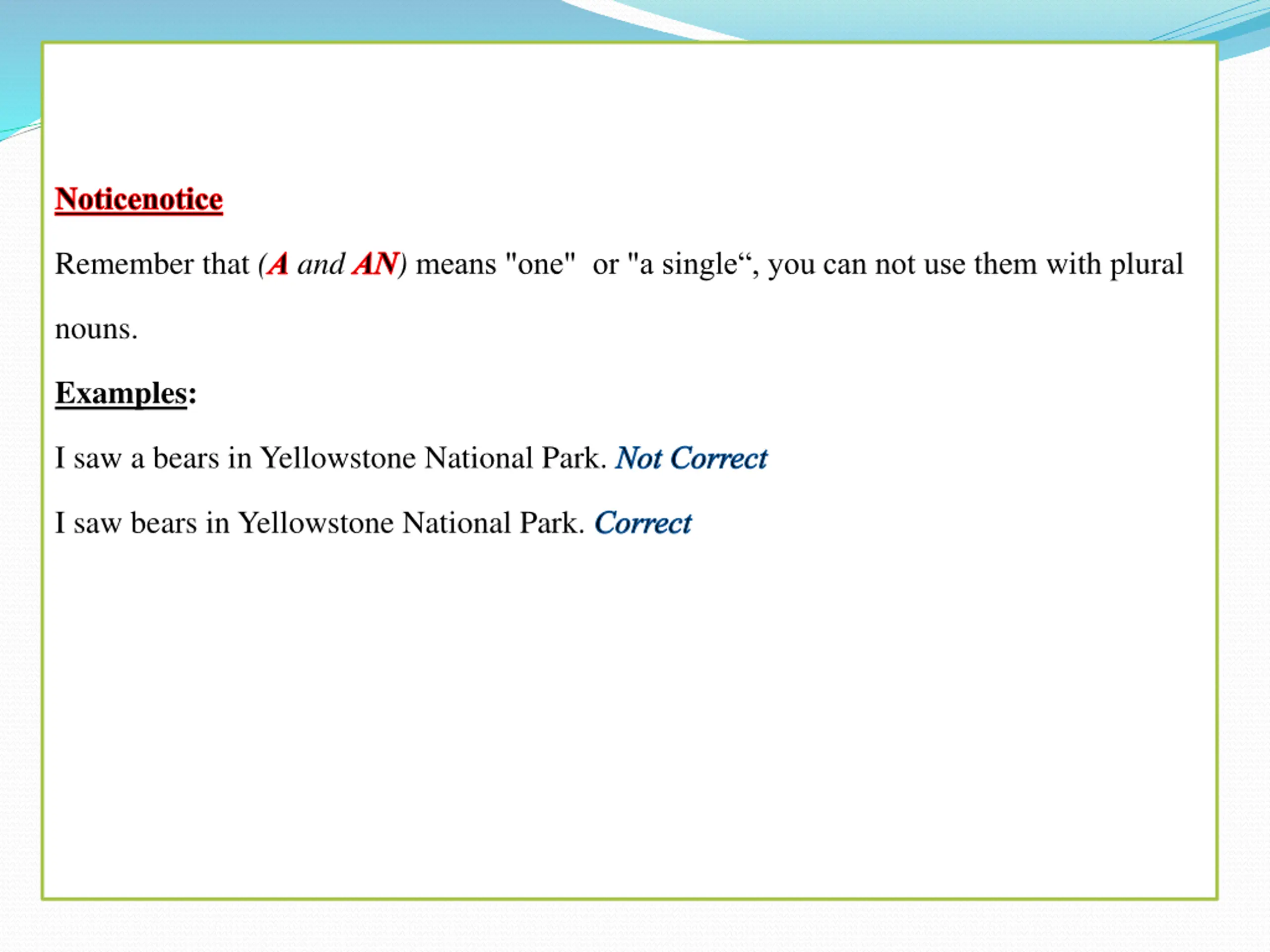 Noticenotice Remember that (A and AN) means "one" or "a single , you can not use them with plural nouns. Examples: I saw a bears in Yellowstone National Park. Not Correct I saw bears in Yellowstone National Park. Correct
