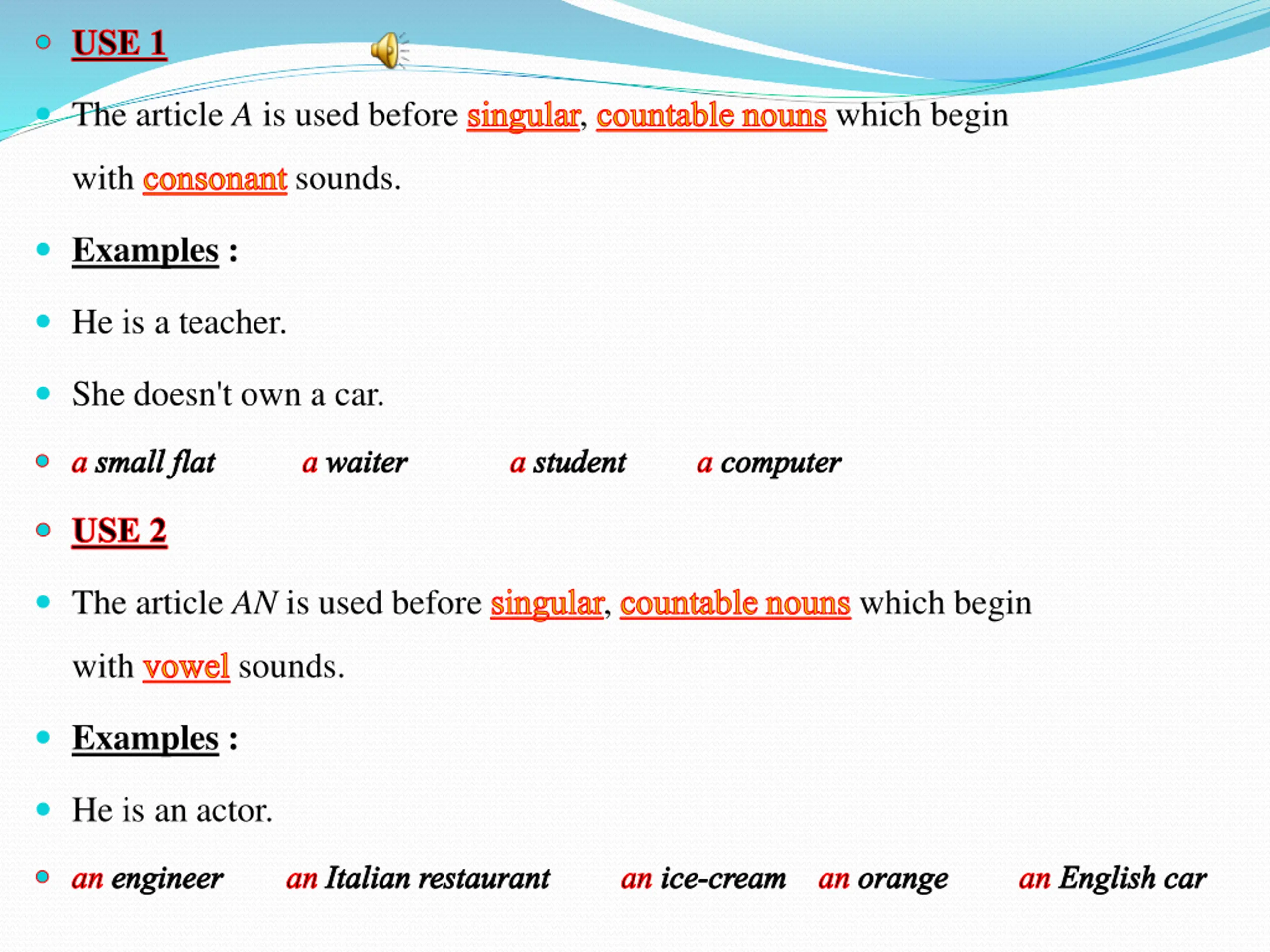 USE 1 The article A is used before singular, countable nouns which begin with consonant sounds. Examples : He is a teacher. She doesn't own a car. a small flat a waiter a student a computer USE 2 The article AN is used before singular, countable nouns which begin with vowel sounds. Examples : He is an actor. an engineer an Italian restaurant an ice-cream an orange an English car