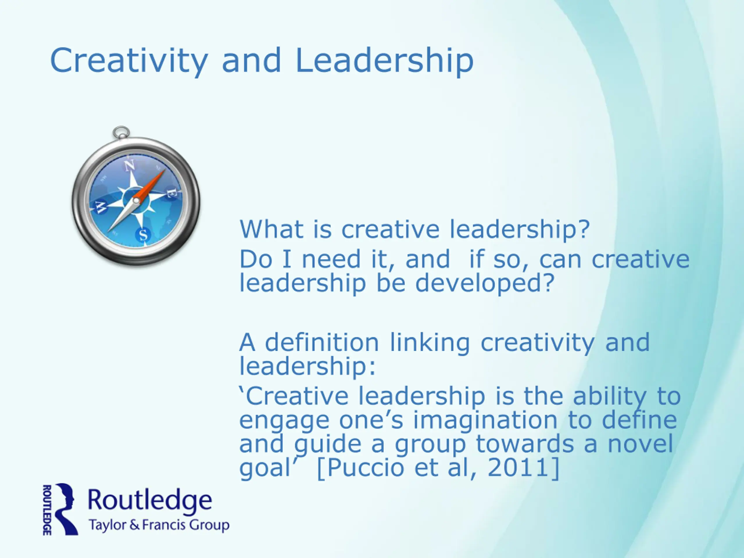 Creativity and Leadership What is creative leadership? Do I need it, and if so, can creative leadership be developed? A definition linking creativity and leadership: Creative leadership is the ability to engage one s imagination to define and guide a group towards a novel goal [Puccio et al, 2011]