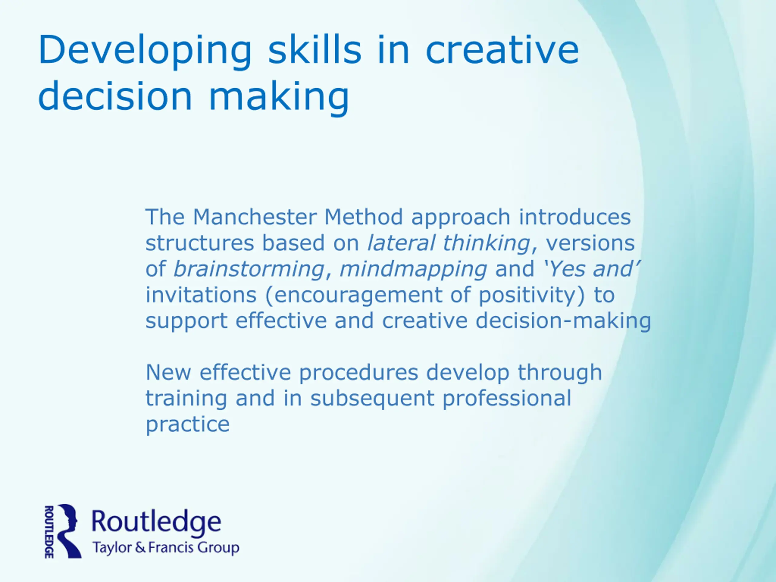 Developing skills in creative decision making The Manchester Method approach introduces structures based on lateral thinking, versions of brainstorming, mindmapping and Yes and invitations (encouragement of positivity) to support effective and creative decision-making New effective procedures develop through training and in subsequent professional practice