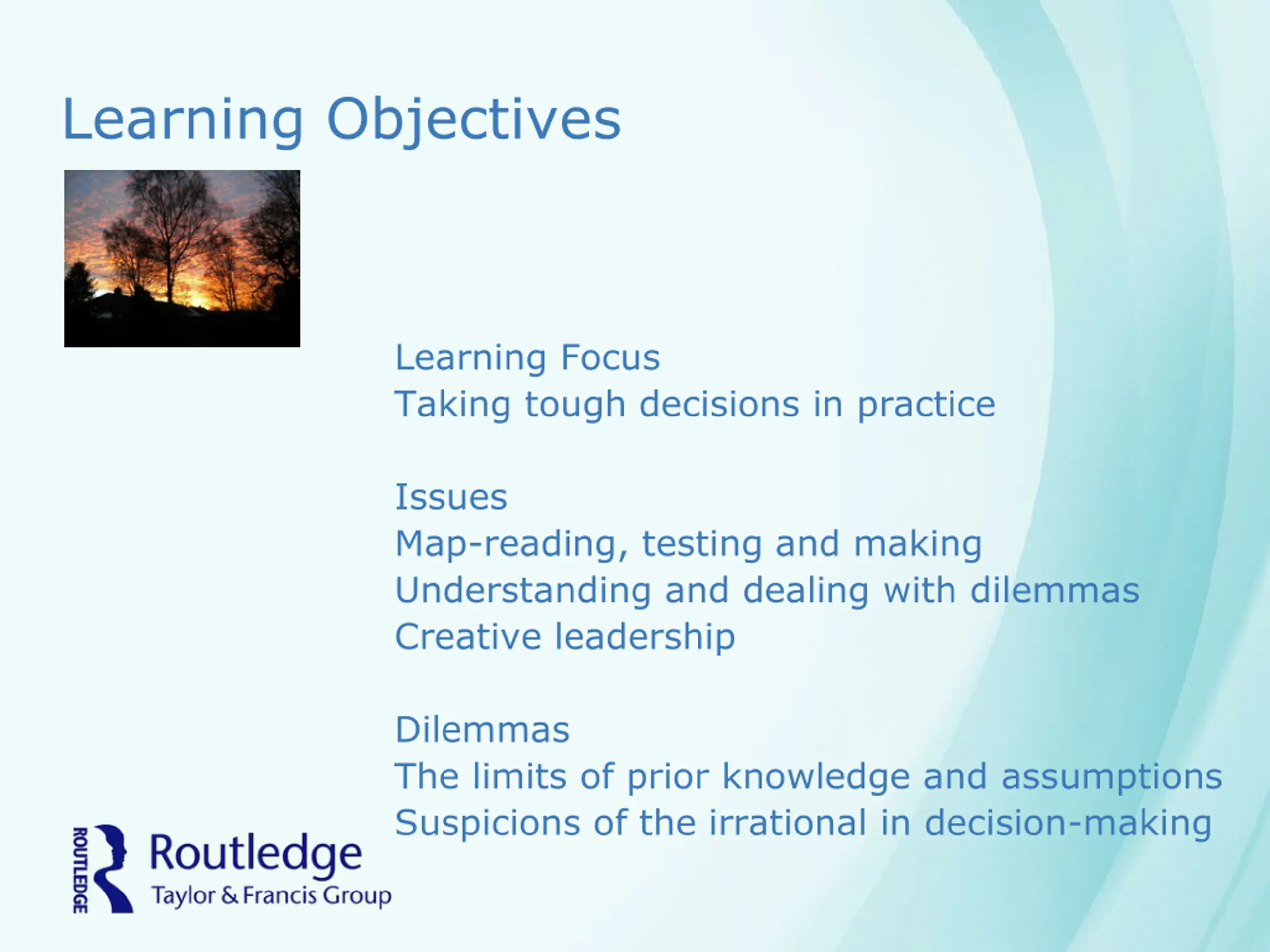 Learning Objectives Learning Focus Taking tough decisions in practice Issues Map-reading, testing and making Understanding and dealing with dilemmas Creative leadership Dilemmas The limits of prior knowledge and assumptions Suspicions of the irrational in decision-making