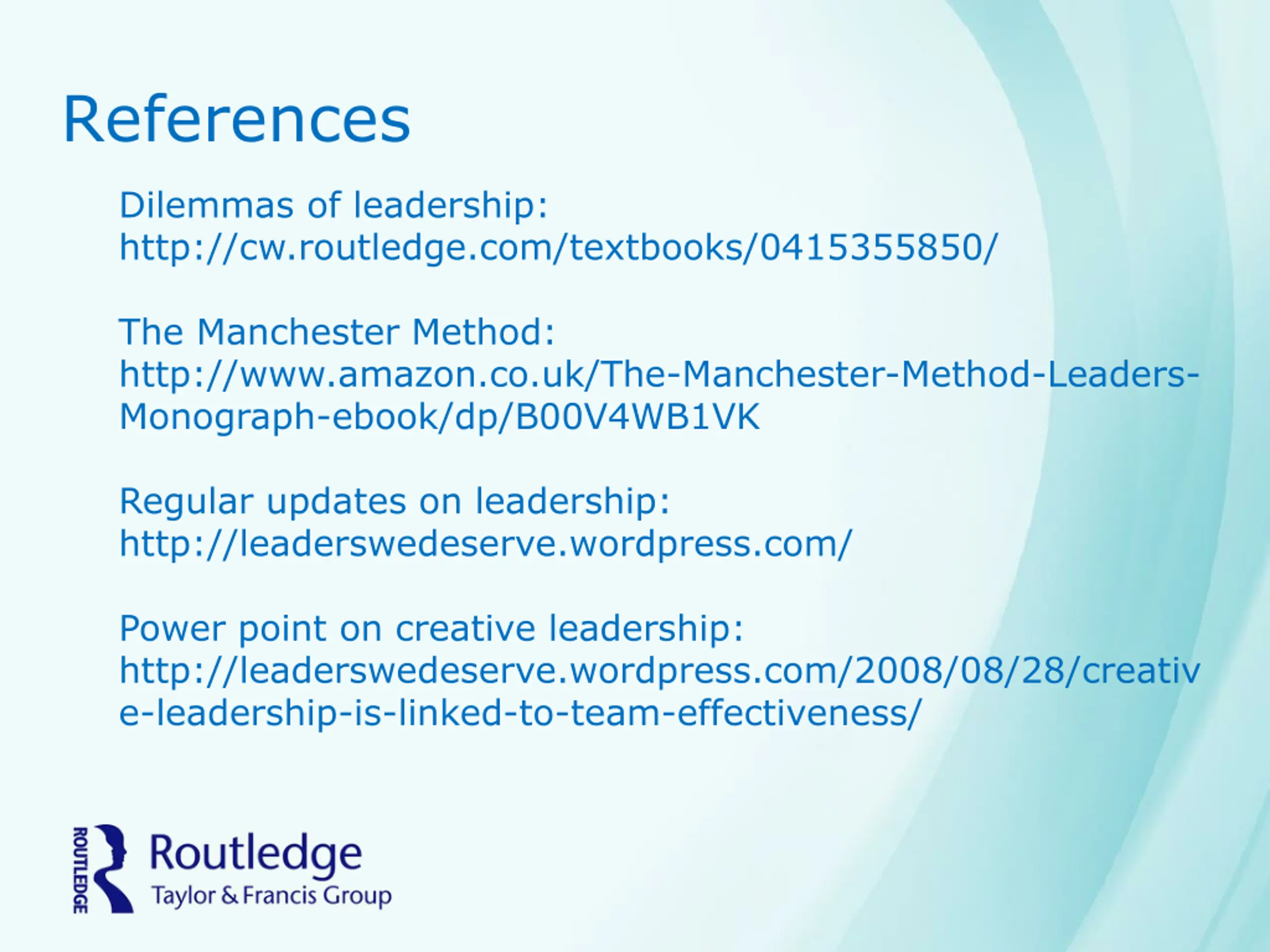 References Dilemmas of leadership: http://cw.routledge.com/textbooks/0415355850/ The Manchester Method: http://www.amazon.co.uk/The-Manchester-Method-Leaders- Monograph-ebook/dp/B00V4WB1VK Regular updates on leadership: http://leaderswedeserve.wordpress.com/ Power point on creative leadership: http://leaderswedeserve.wordpress.com/2008/08/28/creativ e-leadership-is-linked-to-team-effectiveness/