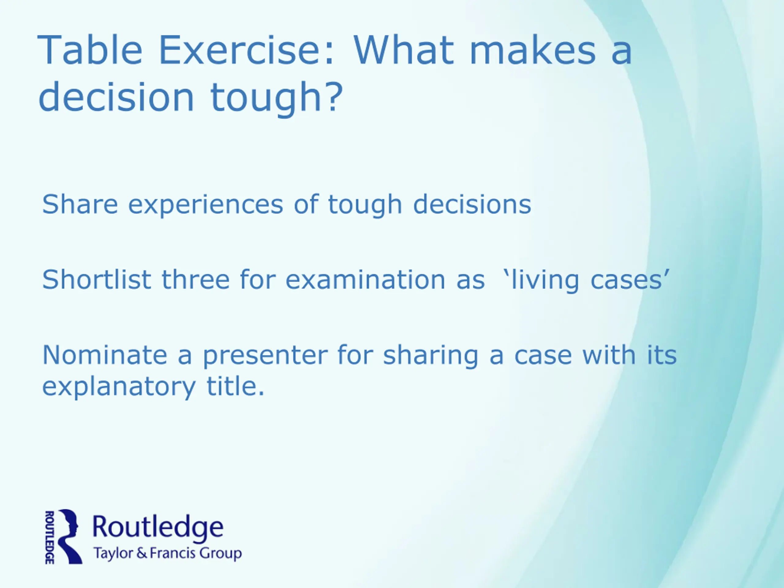 Table Exercise: What makes a decision tough? Share experiences of tough decisions Shortlist three for examination as living cases Nominate a presenter for sharing a case with its explanatory title.