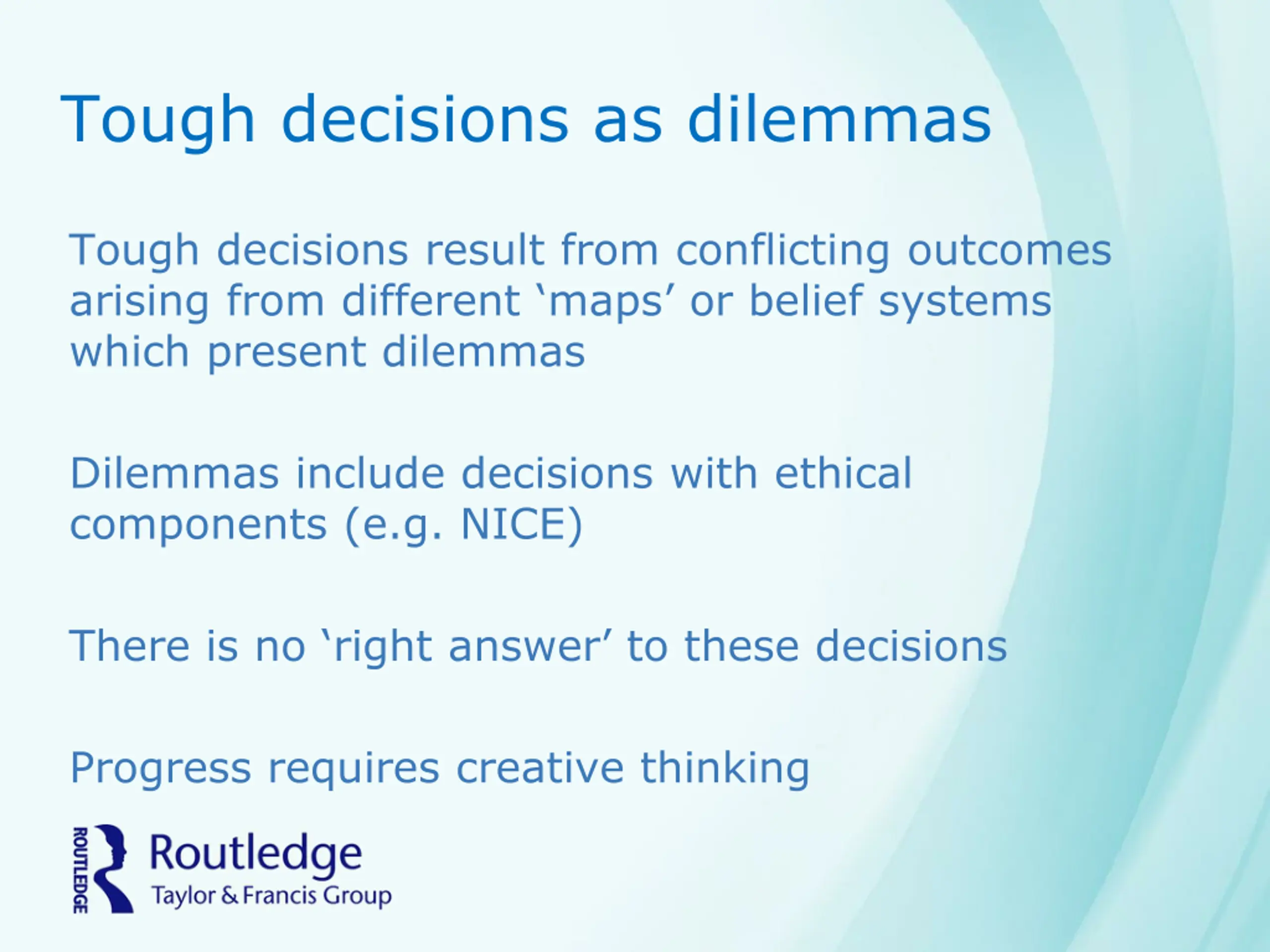 Tough decisions as dilemmas Tough decisions result from conflicting outcomes arising from different maps or belief systems which present dilemmas Dilemmas include decisions with ethical components (e.g. NICE) There is no right answer to these decisions Progress requires creative thinking