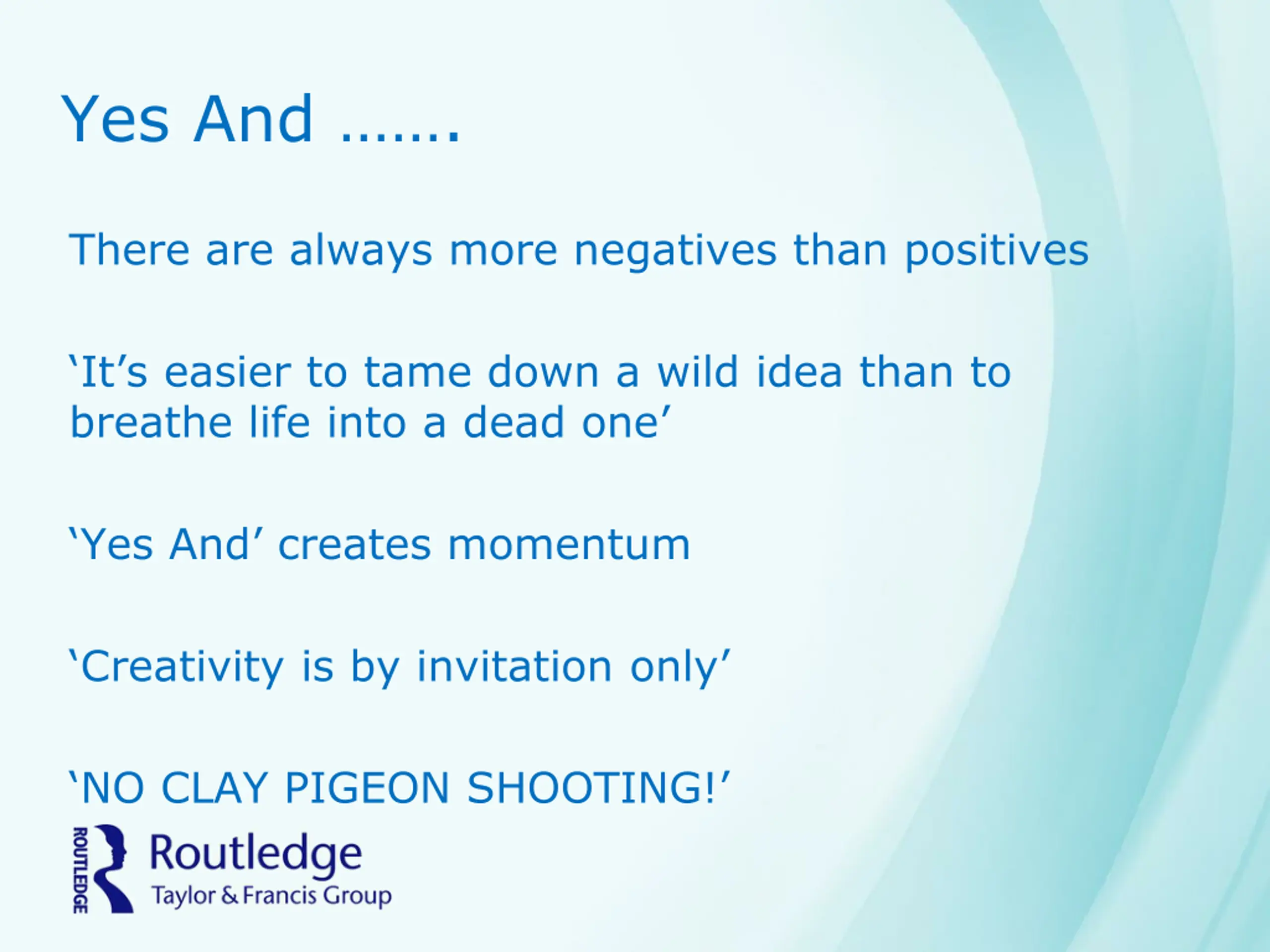 Yes And . There are always more negatives than positives It s easier to tame down a wild idea than to breathe life into a dead one Yes And creates momentum Creativity is by invitation only NO CLAY PIGEON SHOOTING!