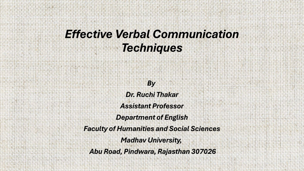 Effective Verbal Communication Techniques By Dr. Ruchi Thakar Assistant Professor Department of English Faculty of Humanities and Social Sciences Madhav University, Abu Road, Pindwara, Rajasthan 307026